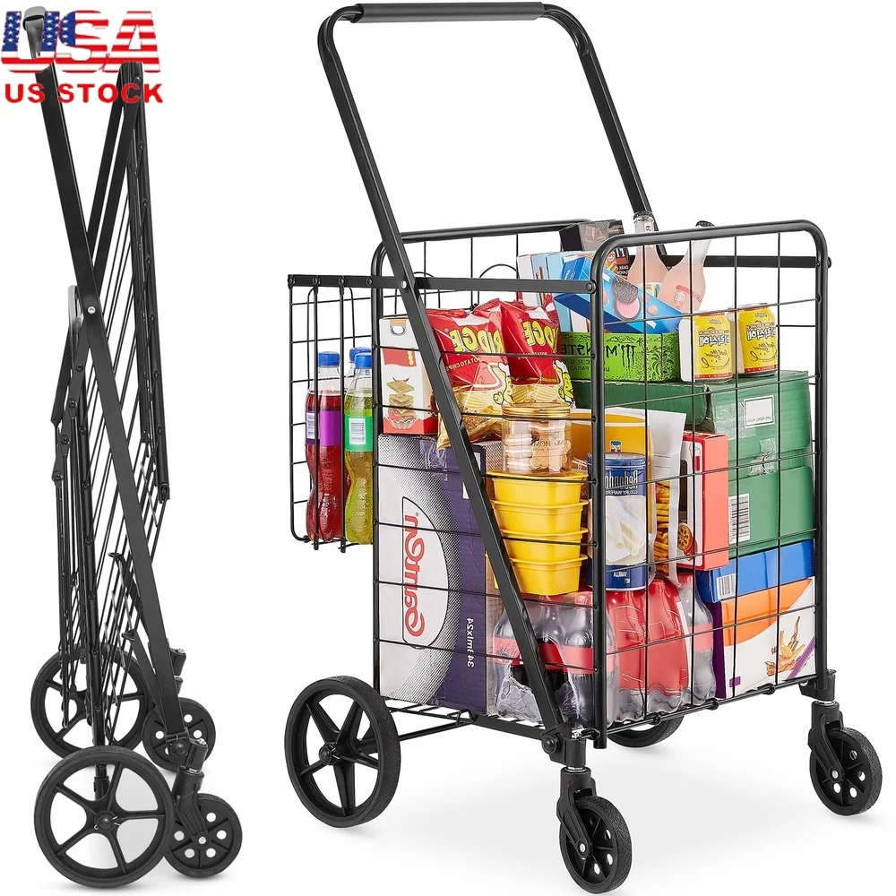 Durable Frame: With a heavy-duty thicken metal frame, the shopping cart boasts a heavy load-bearing capacity of 110 lbs.  Thanks to its powder coating surface, it is anti-scratch and anti-rust.  This cart can be used for a long period time.  Really save your time and money.  Extra Back Basket: The grocery cart for groceries is designed with a front basket and an additional back basket, providing you ample storage space (≥3 Cu. ft Space).  The front large basket size: 17. 4''x14. 4''x21. 7'', the back basket size: 17. 4''x5. 6''x12''.  You can store wallets or other personal items in the back basket to keep personal belongings protected anytime in shopping.  4 Durable Wheels: Our utility shopping cart with 4 industrial PP swivel wheels ensure smooth movement, even when fully loaded.  The 360° rotating front wheel enables easy direction changes, while the 7. 3" diameter rear wheel allows the cart to glide effortlessly on flat surfaces or in cracks.  Compact & Collapsible Design: The portable design makes the folding shopping cart easy to fold up in seconds for convenient transportation and storage.  Just store it in the trunk, garage, cabinet, closet, or under the bed without occupying excessive space.  Versatile & Hassle-Free Assembly: Our utility cart is designed to effortlessly transport a wide range of items, including laundry, groceries, camping gear, and more.  Assembly is a breeze, as it comes with a user manual and all the necessary hardware.  Simply unfold the pre-assembled cart body and attach the wheels for quick setup.