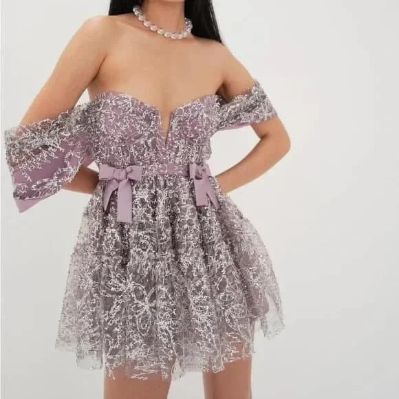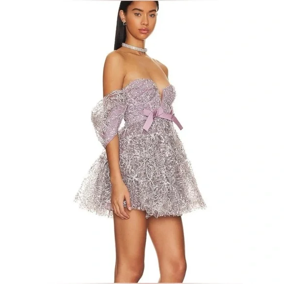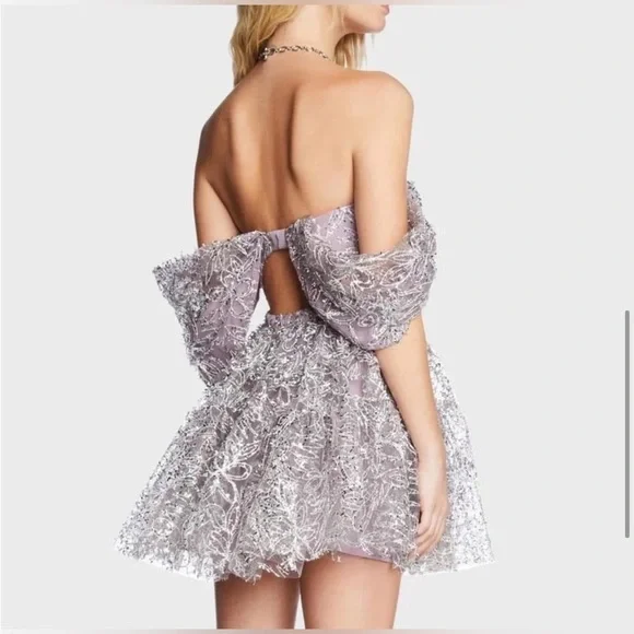 BRYNNE MINI DRESSis cocktail party-approved! This mini dress has a tulle construction with metallic detailing, an off-the-shoulder neckline, draped sleeves, gathered underwire bust cups, bow appliques at front, a zip closure, and a back cutout with hook-and-eye closuMATERIALSSelf 100% Polyester Contrast Fabric 97% Recycled Polyester 3% Spandex Lining 98% Recycled Polyester 2% SpandexCAREDry Clean Only