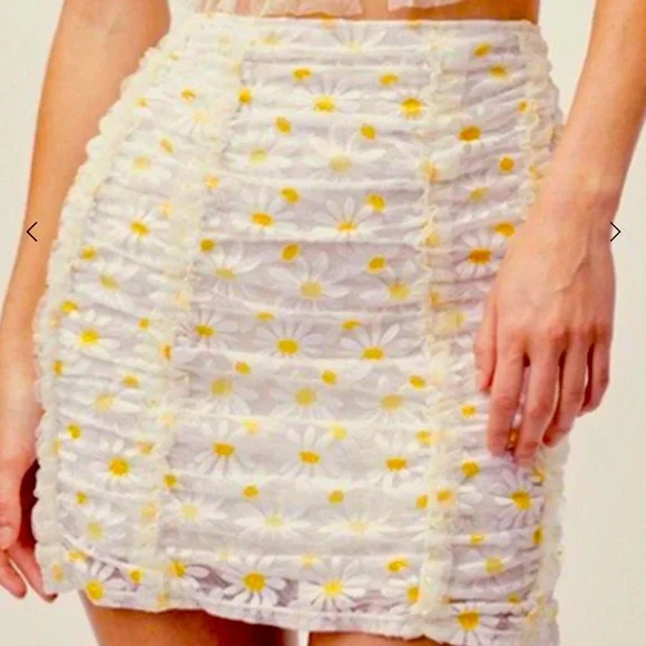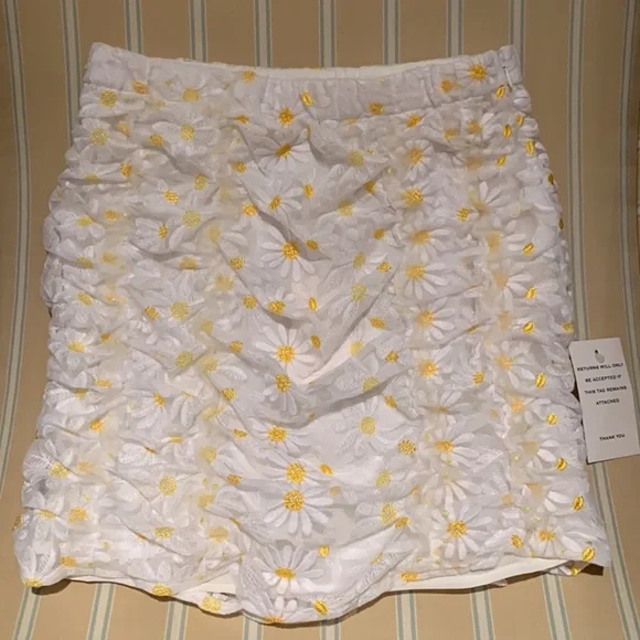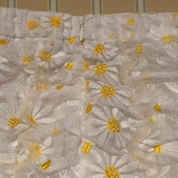 🌼🌼🌼🌼LACEY GLAM MINI SKIRT 🌼🌼🌼🌼Beautiful Mesh Knit Fabrication with Allover Embroidered Daisies Mini Style Runched Panels with Tulle Detail and Tiny Yellow Embroidered Dot’s, Sooo Pretty, see last picture Banded Gathered Elasticized Waist with Hidden Side Zipper Closure Fully Lined In a White Poly Spandex Fabric28” Waist 15” LengthPriced to Sell 💯