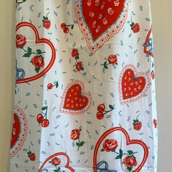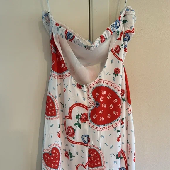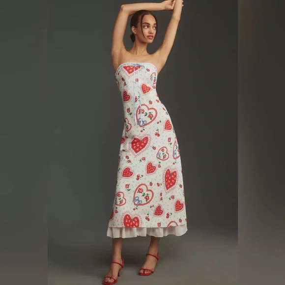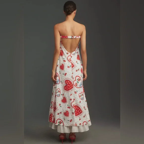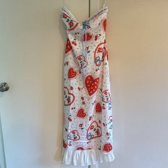 Size Medium - like new, worn once for a few hours and dry cleanedItalian-inspired hearts and cherries top this For Love & Lemons strapless satin midi dress in a sweeping backless silhouette.Features- For Love & Lemons Daisy Mae strapless midi dress- Heart-printed satin midi dress- Slotted ribbon at the strapless bodice- Open back with a clasped strap- Airy chiffon underlayer- Body-skimming fit- Midi length- Fully lined- Back zipper and clasp closures