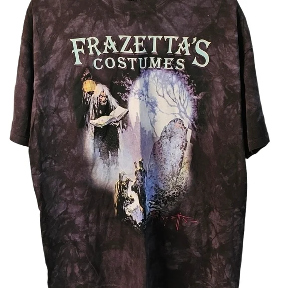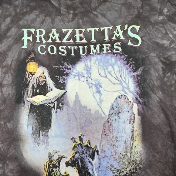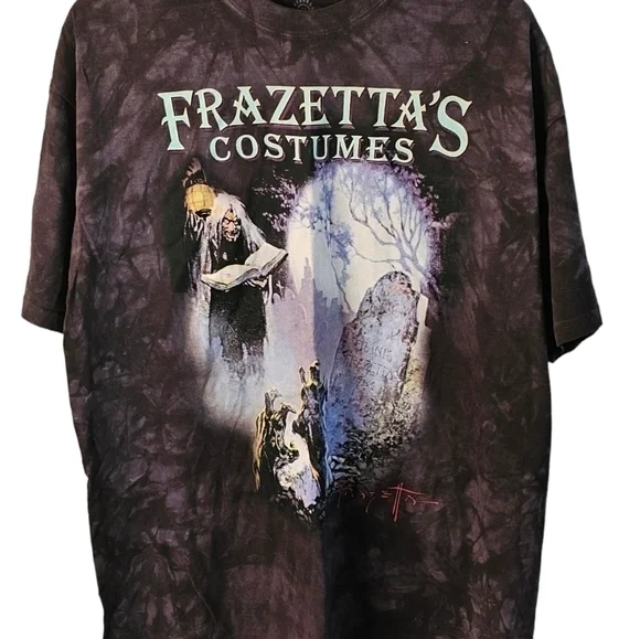 Frank Frazetta Costumes Mens Graphic TShirt XL The Mountain Graveyard Creepy USA. Great Preowned condition lightly worn see photos. Awesome front graphic by Frank Frazetta. Pit measures 23 inches wide. Length is 29 inches long. Both measurements are pictured. All shirts are packed in a poly bag after listing. One day handling time.