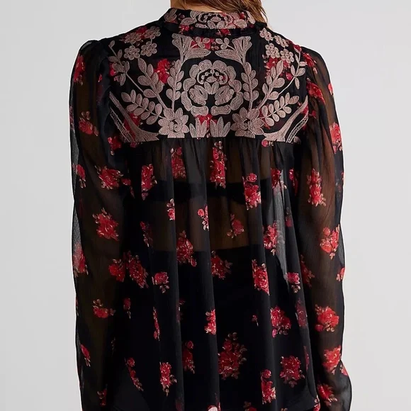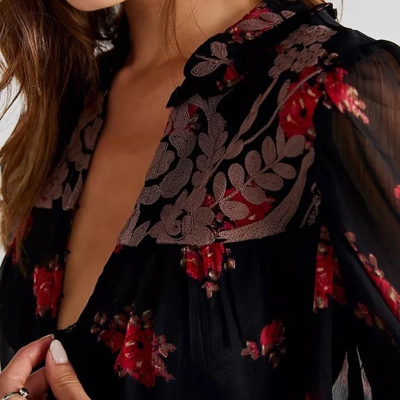 The perfect blend of sweet and sultry, this so cool, semi-sheer top features floral detailing throughout and defined embroidery at top for added dimension.Fit: Relaxed, drapey fitFeatures: V-neckline, rounded bottom hem, textured fabrication, pleating throughoutWhy We <3 It: Designed to take you from your daytime thing to a special date night, this goes-with-anything top is the perfect pick for any occasion.Care/ImportMachine Wash ColdImportMeasurements for size smallBust: 42 inLength: 27 inSleeve Length: 28.5 inContents100% Polyester