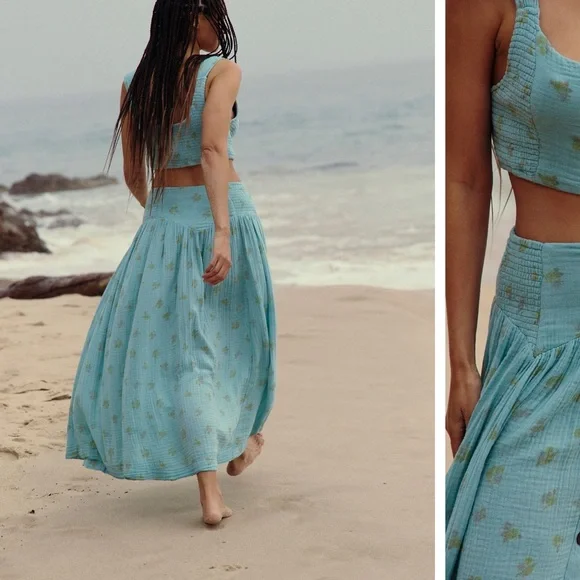 Color: Pinky combo Nile BluePlease note: This set has some natural pillings. Perfectly printed and just as romantic, this sweet set will turn heads with every wear.Fit: Top: Slim, cropped corset-inspired silhouette; Skirt: High-rise, billowy fitFeatures: Top: Front button-up closures, smocked paneling, tapered sleeves, soft floral print; Skirt: Button down closures, smocked paneling, coordinating floral printWhy We ❤ It: Effortlessly paired together or styled separately with ease, this set has endless ways to wear.Care/ImportHand Wash ColdImportSize + FitMeasurements for size XLSkirt Waist: 32”Skirt Length: 36”Top Bust: 40” relaxed Top Length: 16”Contents100% CottonSmocking: 70% Polyester, 30% SpandexB-4SR
