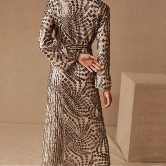 Shine bright in this beautiful American made embroidered maxi, adorned with silver sequins that catch the light at each turn. Featuring a slight V-neckline and high front slit. Wide, sheer sleeves. Fully lined. Care/ImportDry Clean Made in the USA Measurements for size Small Bust: 40.0 in Length: 54.0 in Sleeve Length: 21.0 in Contents 100% PolyesterNew with tag. Never worn. Authentic 💯 %.B-11