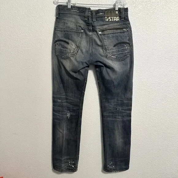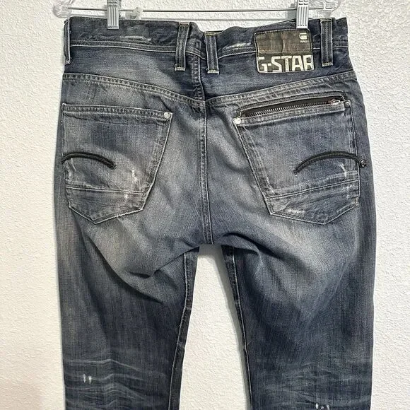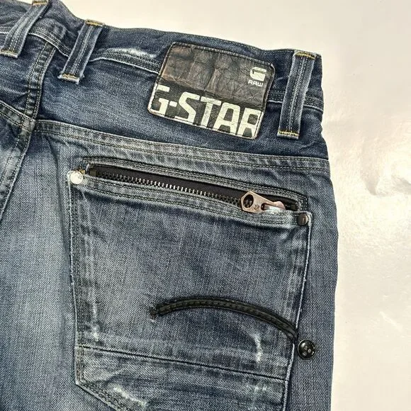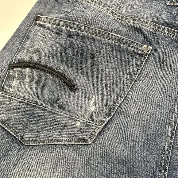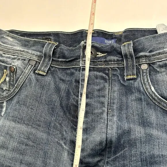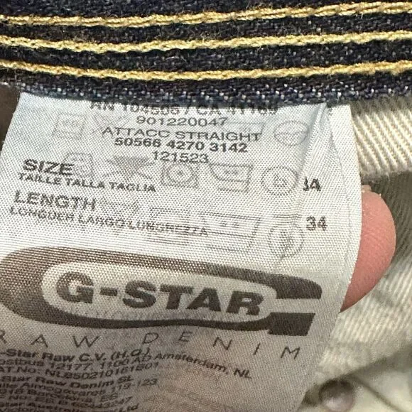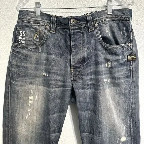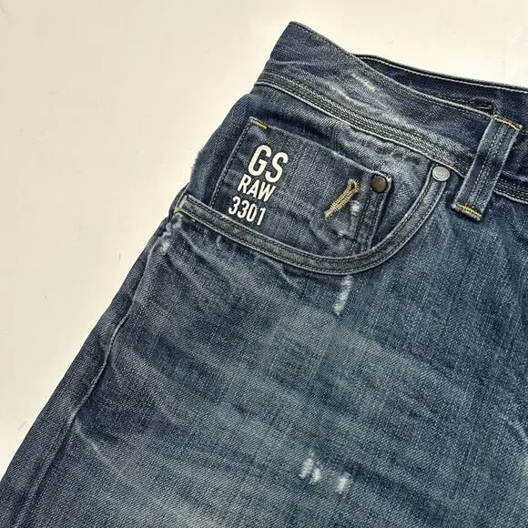 G Star Raw Men's Jeans Size 34x33 3301 Denim Distressed Attacc Straight Made In Italy.There a few blemishes/stains as shown in pictures.Measurements in photos is from seam to seam in the waist and bottom of crotch to bottom of length.. Please compare measurements to clothing you already own before ordering. Jeans have been laundered but always suggest washing any pre owned garments.. please look at all photos and feel free to contact me with any questions..