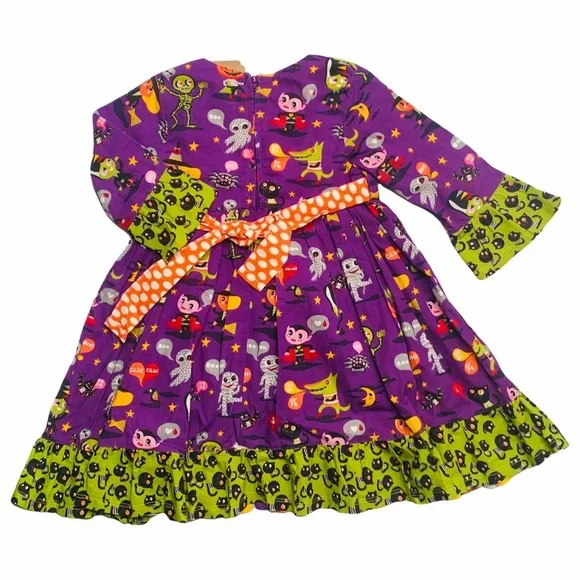 G10-Jelly the Pug, 4Y, l/s cotton layered dress, 4 Years, Purple/Green Halloween: child new with out tags or new, purple, green, orange, multicolored Halloween ruffled dress, mummies, vampires, spiders, skeletons, bats, black cats, ghosts, witches, twirl dress, ruffled sleeves. 🎃 shop more on ThreadHouston.com 🎃