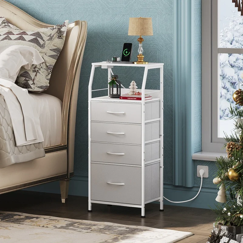 GALAXHERO Nightstand with Charging Station LED Light 4 Drawer Dresser Bedside Table Fabric Storage Bins Open Shelf Metal Frame