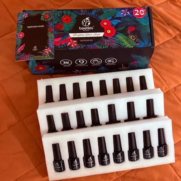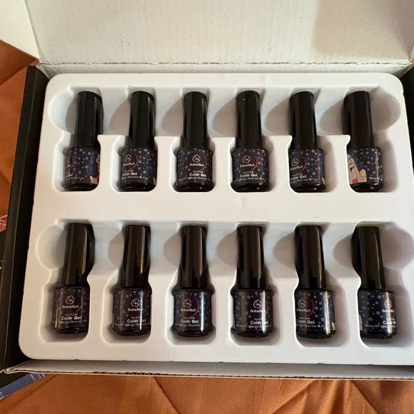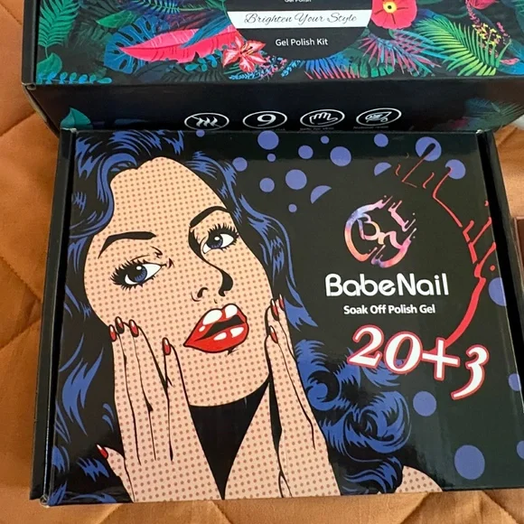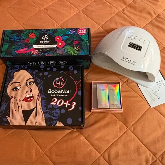 I was planning to try doing my own gel nail polish manicures but just never got around to it and I changed my mind about it.These are 2 boxed sets of gel polishes, 20 colors each. And 2 boxes of singles (base and top coats I think) Everything is brand new, except the lights which was tested a couple of times. Babe Nail Set: 20 Colors Gel Nail Polish Kit.Base Top Coat, Glossy & Matte Top Coat and Base Coat.Beetles Set: 23 Pcs Fall Harvest Gel Nail Polish Kit 20 Colors with Base Gel Top Additional Base & Top Coat by EzclassyThere is also an LED Nail Dryer Lamp. Last I knew, it was working fine.You get a large variety of color! The bottles are small. Not sure if that's typical or not. There is some storage wear to the boxes and price tag residue. Bottles themselves are all fine. They have NEVER been used or tested All new.From a non-smoking home.