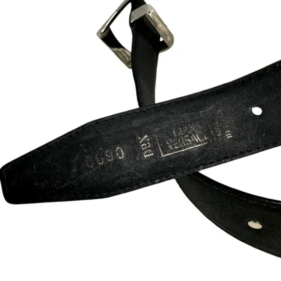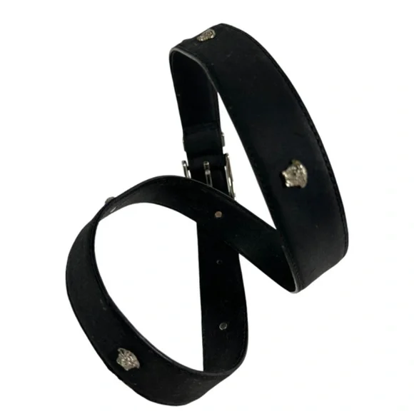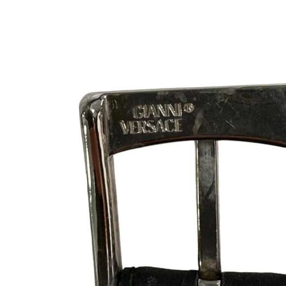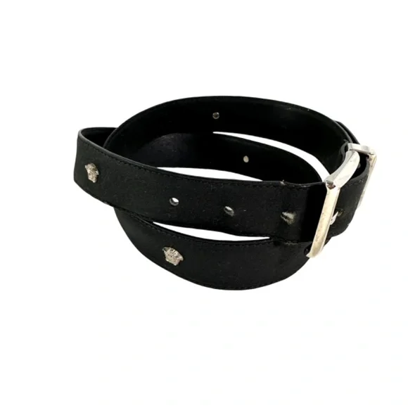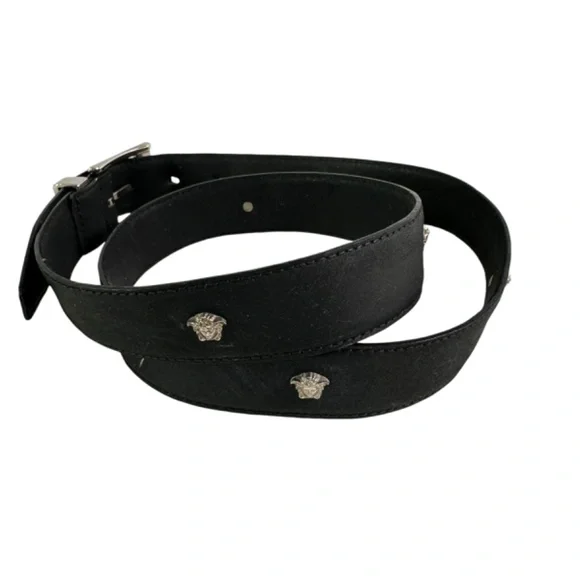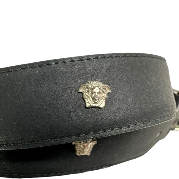 You are looking at a genuine leather belt from Gianni Versace. Belt measures 39"1 long with 31"2 from the first perforation and 35"2 at its last perforation from buckle and 1"1 wide. The condition of this belt is good for its age with no holes and very minor rubbing on bottom of belt. This Versace belt is made of black leather with silver tone medusas and belt is a great vintage find. 100% genuine GIANNI VERSACE size 34 made in Italy.