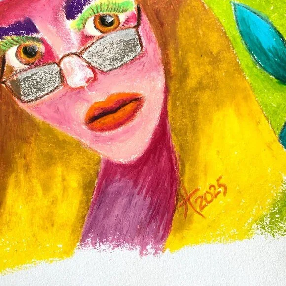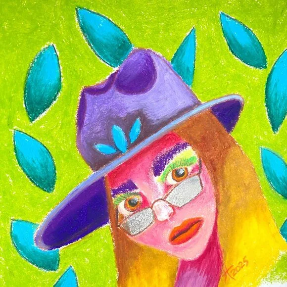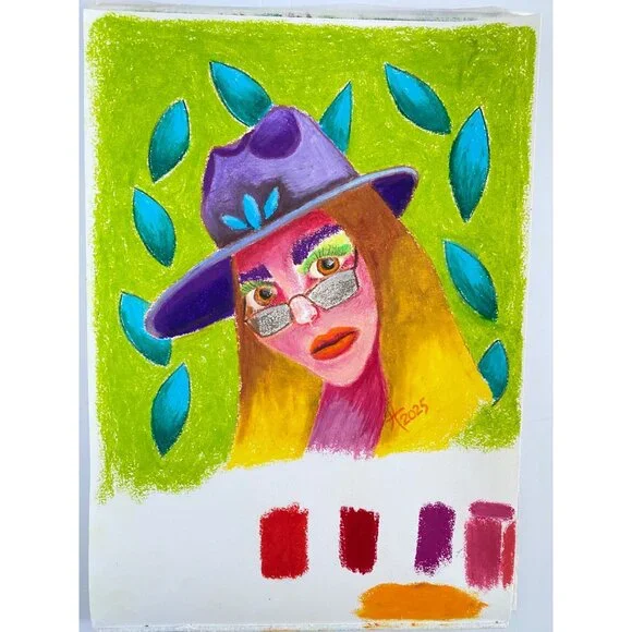 'Girl in a Purple Hat" is an original colorful Oil Pastel portrait on pastel paper by artist Tristina Dietz Elmes.This artwork will arrive with a backing board, but no mat. It will fit nicely directly into an 8x8 inch frame of your choice or mount it into a mat with an approx 8x8 inch hole with white artist's tape.Name: Girl in a Purple HatArtwork: 8.25 inches x 8.25 inchesTotal Surface Size: 8.25 inches x 11.65 inchesSurface: Artist Pastel PaperMedia: Oil PastelsMatted: NoMatted Size: N/AFraming: NoSigned: YesCreated: May 2025Please take a look at the photos for details and feel free to ask questions. I am happy to help! 😀There are many more fun items and collectibles in Tristina's Attic. So, please take a look around and follow the store for easy access to new items added weekly. Happy Shopping! 🛍️