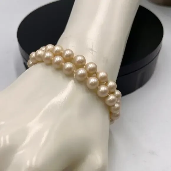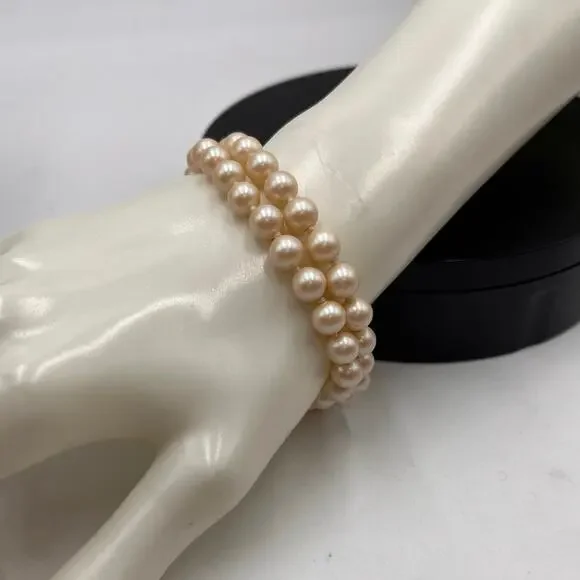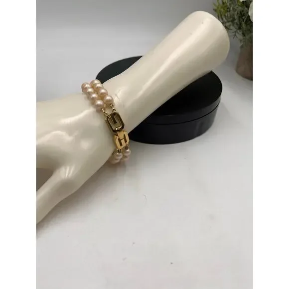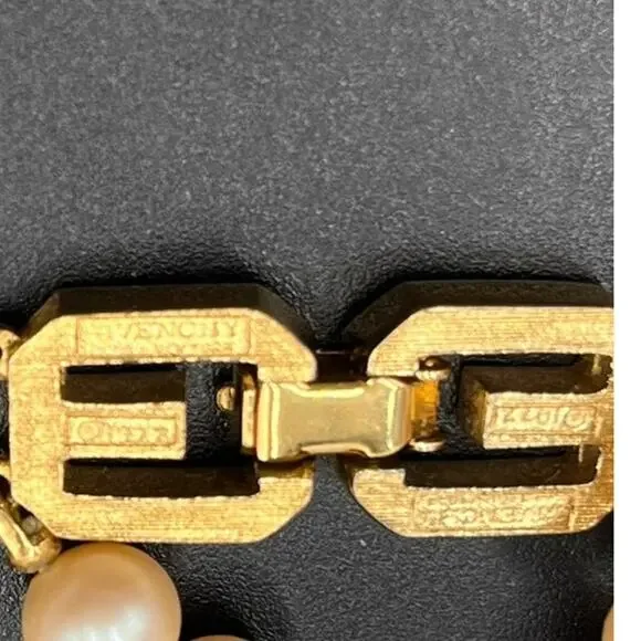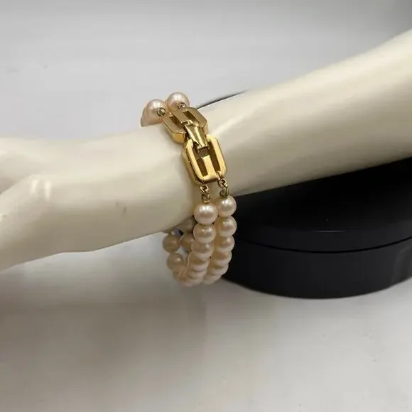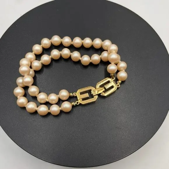 This is a Givenchy double-strand pearl bracelet with a gold-tone "G" logo clasp. The bracelet is vintage, as indicated by the clasp style and hallmark engraving. The pearls are faux pearls, which is common for vintage costume jewelry.Givenchy is a French luxury fashion and perfume house, and its vintage jewelry is highly collectible.The Pearls are nice and weighty. Signed Givenchy Paris New York Size 7-7.50”6mm pearls Cream neutral color There is some slight green where the thread meets the clasp see photos Hand knotted