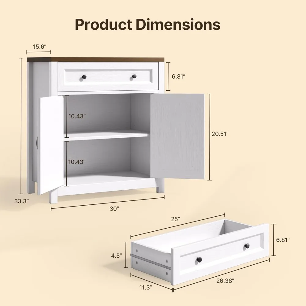 • Beauty and Practicality Combined: This farmhouse decorative cabinet's tabletop is made of antique wood grain, which is stain-resistant and wear-resistant. In addition, this farmhouse coffee bar also features an anti-tip design for stability and reliability. Drawers with slides and a magnetic, silent door design greatly improve the practicality of this storage cabinet