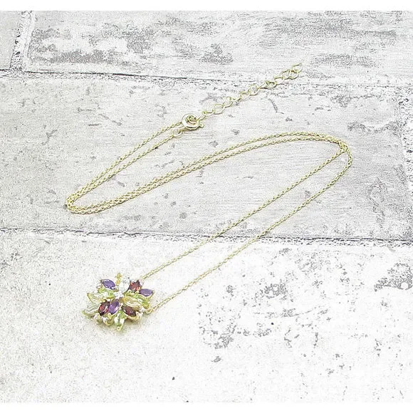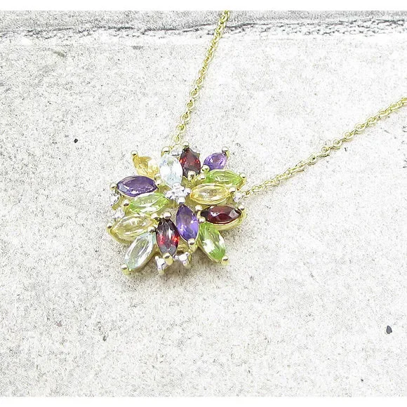 Jewelry Type: Pendant & Chain Metal Type: Gold Over 925 SilverMetal Size: Pendant 1" & Chain 20" - 22"Stone Type: Diamond & Gemstones Diamond Weight: .01ctwCondition: N/AJewelry Weight: 4.9 Grams Please Note: This item is pre-owned. It may contain scratches, scuffs, dents, markings, engraving, be broken, and/or be tarnished. We make a very strong effort to upload clear pictures. Please inspect all pictures and ask all questions you may have prior to making a purchase. Not all stones are genuine. Some are enhanced or man-made.