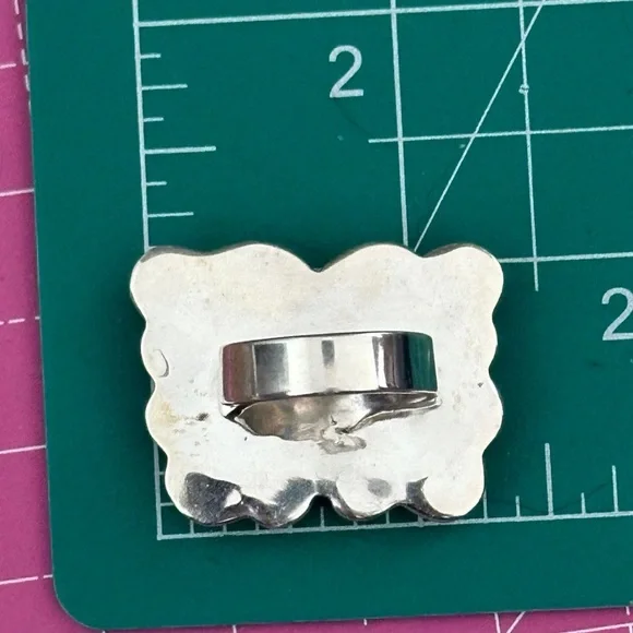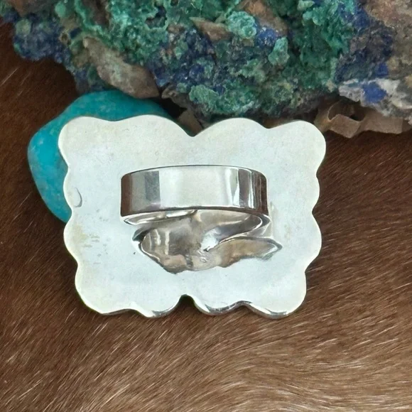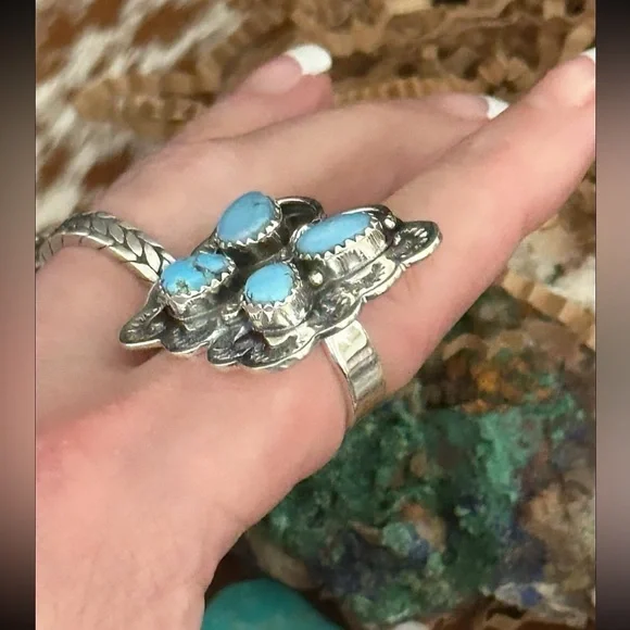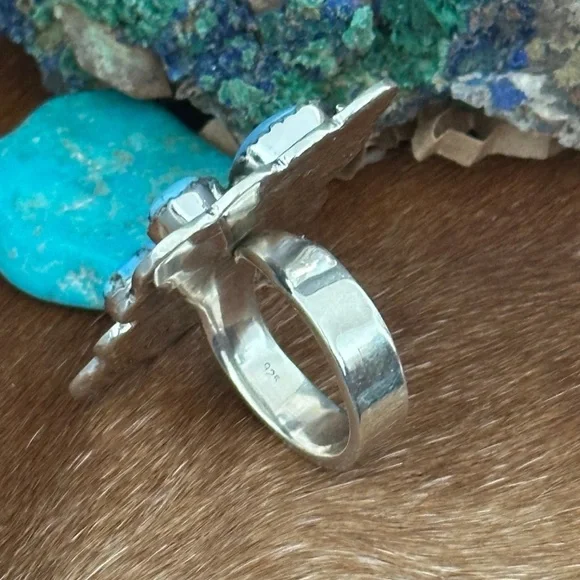 She is adjustable. Golden Hills genuine gold Hill stones in this butterfly piece. You have four gold Hills turquoise stones in the beautiful stamp work butterfly. Guarantee 925 Sterling silver with a full sterling back. These adjustable rings are my favorite. They personally give me a lot of comfort and you can size them to fit any finger five through 10. New #.