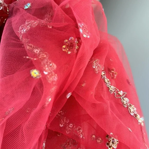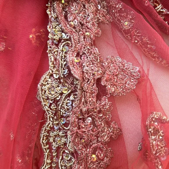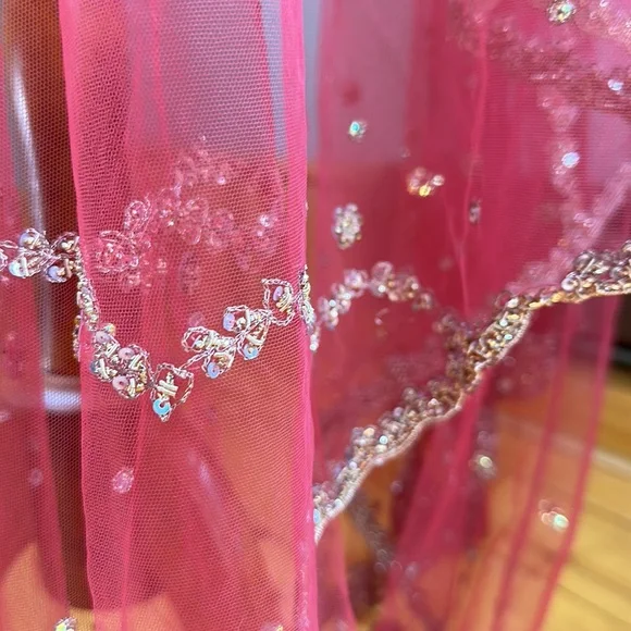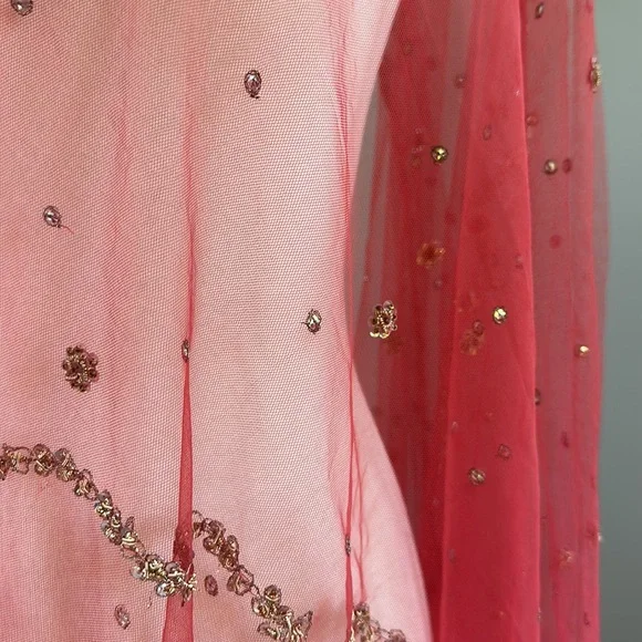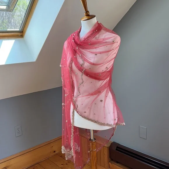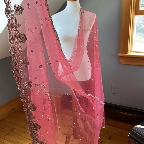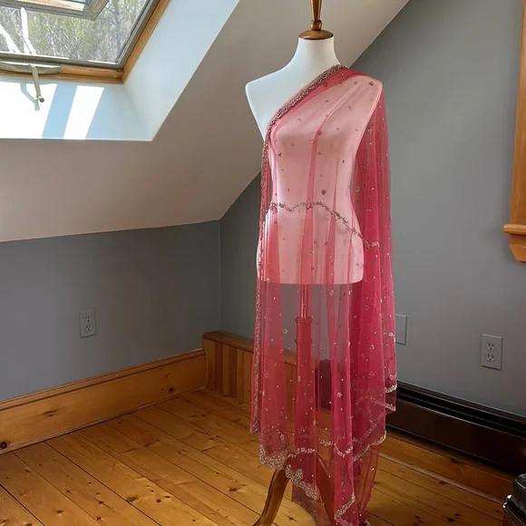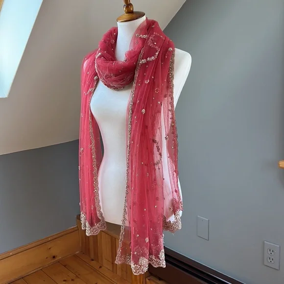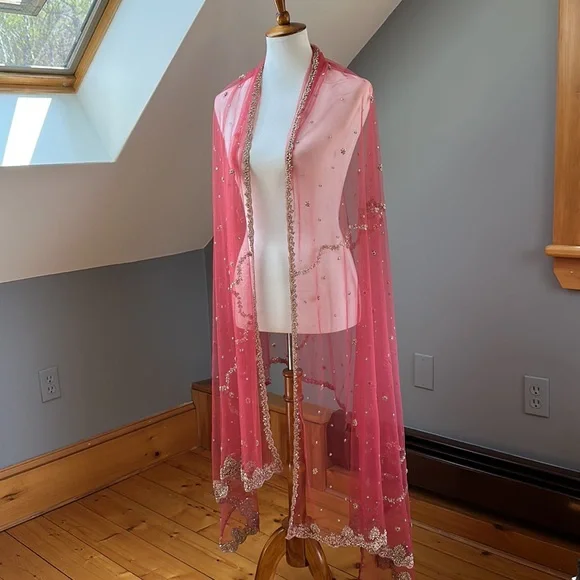 A beautiful example of a classic look out of India, this net shawl has a scattered embroidery of flowers on the field of pink with a heavy metal Zardozi border giving it a distinct glamour. Perfect for a wedding, night out, or even a festival if you want to step it up.True Vintage, in excellent condition. Started life as a party dupatta long ago and far away. From a smoke free home, will be sent with great care.Questions, bundles and offers are always welcome! Thanks for stopping into my Posh closet :)