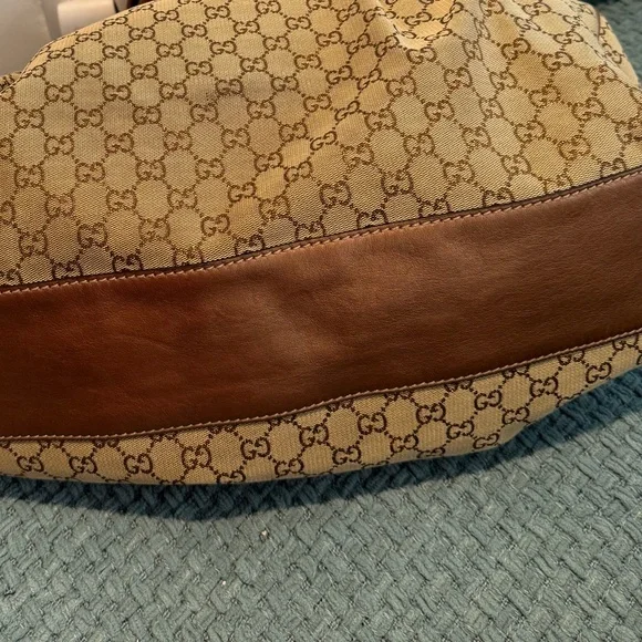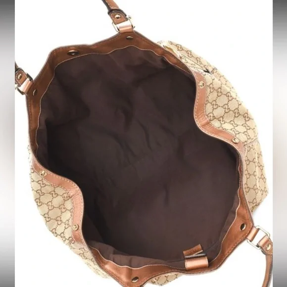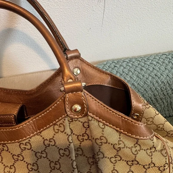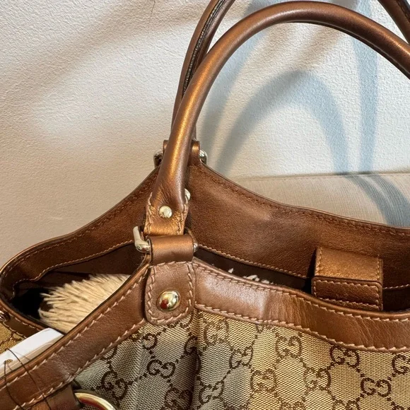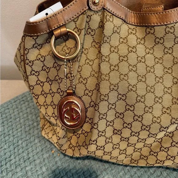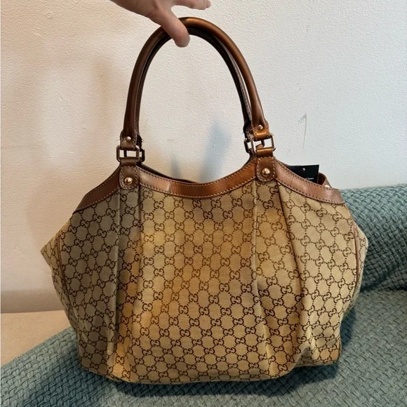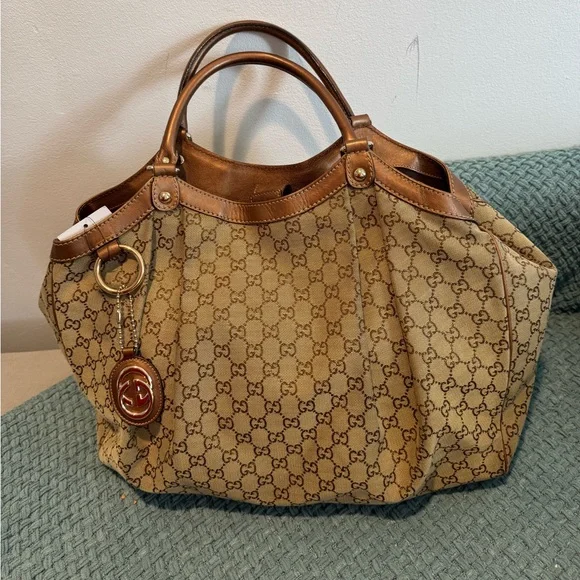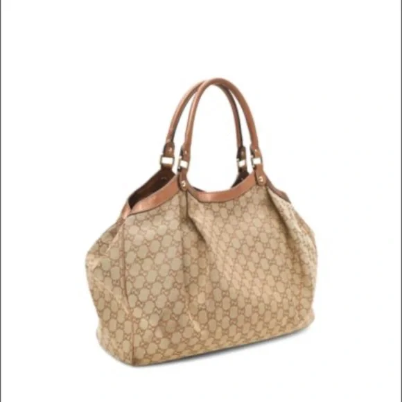 Authentic Gucci Sukey GG Monogram Canvas ToteElegant and versatile Gucci Sukey tote in classic beige/ebony GG canvas with brown leather trim and gold-tone hardware. Includes signature interlocking GG medallion charm. A perfect everyday luxury bag!👜 Details:•Style: Sukey Tote•Material: GG monogram canvas with leather trim•Color: Beige canvas / Brown leather•Hardware: Gold-tone•Double rolled leather handles•Interior: Spacious with zip and slip pockets•Closure: Magnetic snap•Includes: Gucci GG charm tag📏 Approx. Measurements:Width: 13.5”Height: 10.5”Depth: 5”Handle drop: 7”📌 Condition:Good pre-owned condition. Minor creasing and signs of use on leather trim (see photos), but no stains or tears. Clean interior.✨ 100% Authentic