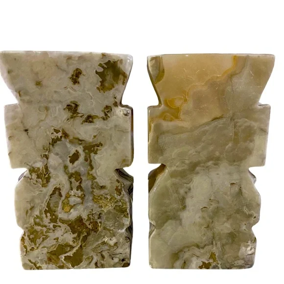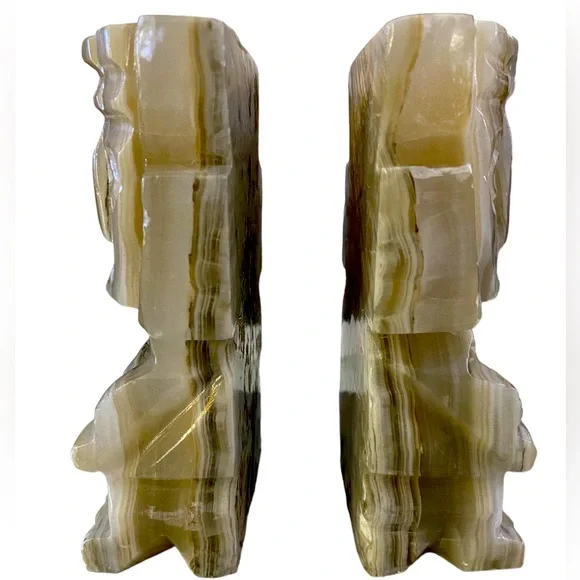 Preloved pair of vintage hand carved solid marble, aztec Tiki, warrior bookend sculpture, figurines art decorMeasurements: 6”Hx3”WWeighs about 3lbsCan also be used as home art decor as a lovely addition to tabletop, desktop, bookshelf, fireplace mantle or simply given as a gift* there are very minor signs of wear around the edges no visual, but can be felt