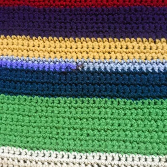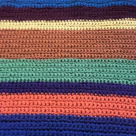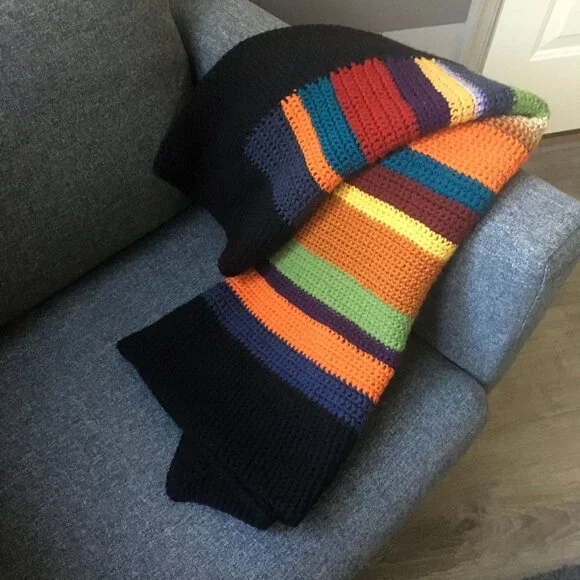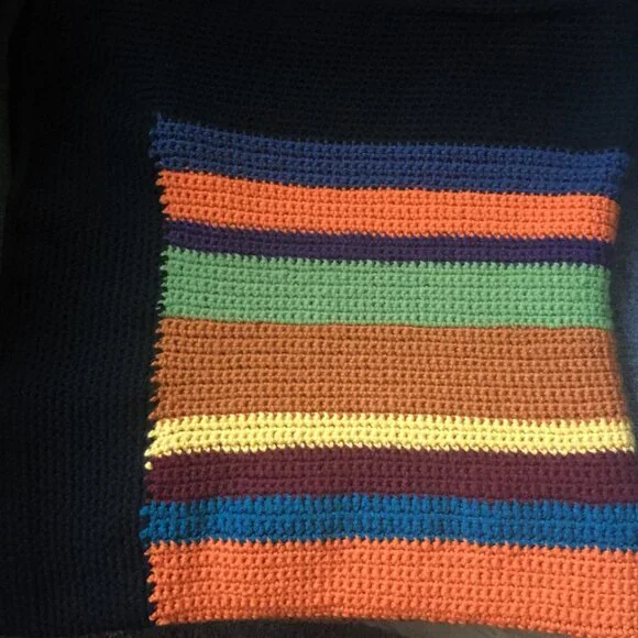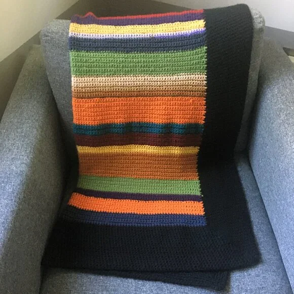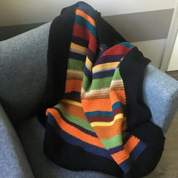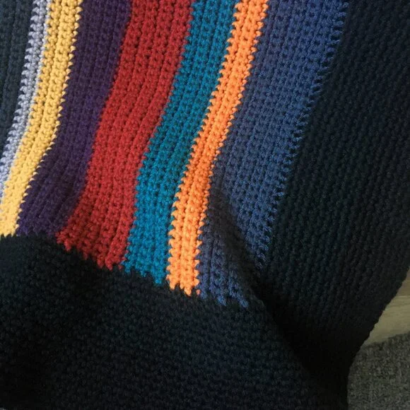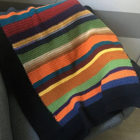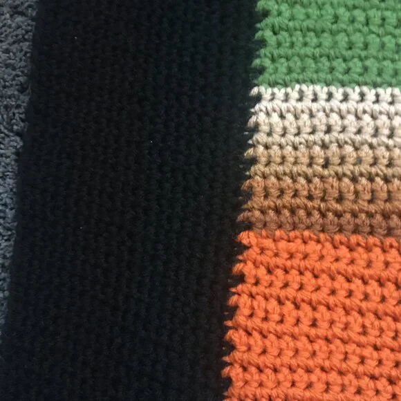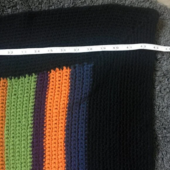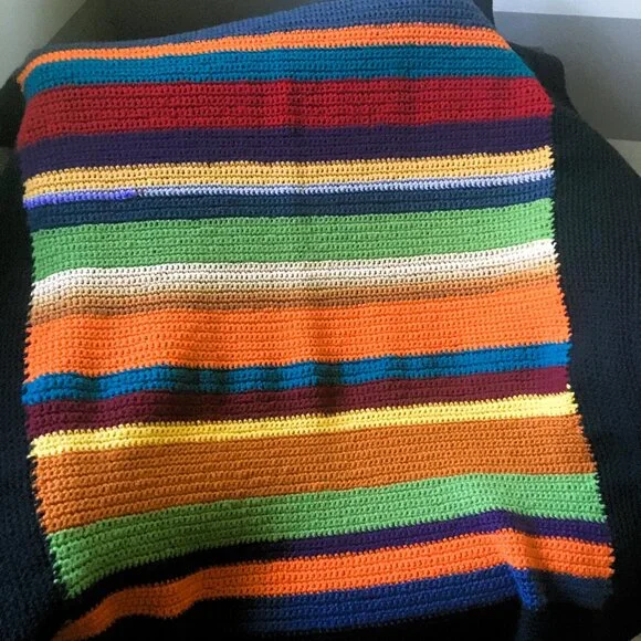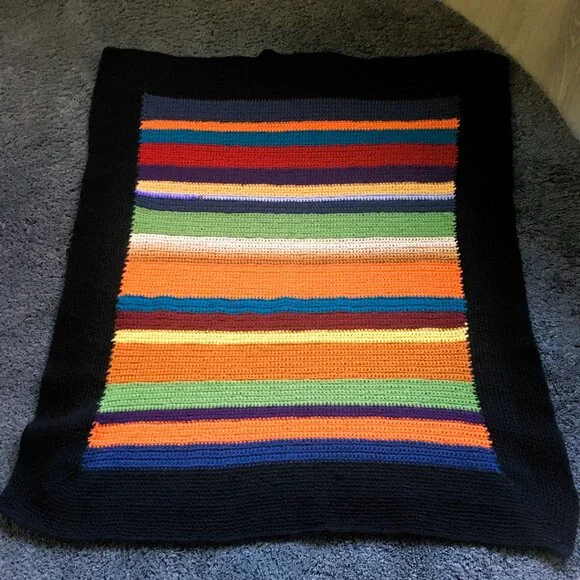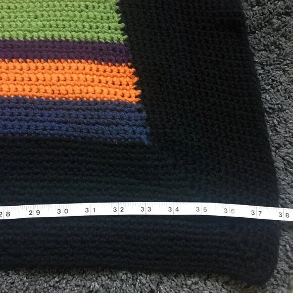 - Striped, square blanket crocheted with a variety of colors and a 5" black border- Black border has a subtle tonal effect, the product of two different tones of black yarn, one cool and one warm- Lightweight, and easy to care for- 100% acrylic- Bold and bright colors, with an orange, yellow, and red colorway, and Halloween aesthetics- Machine wash cold and tumble dry on low heat- Handmade, brand new, under the Passeig Artist label and original- See my other listing for a more rectangular shape throwMeasurements:- Length: 43”- Width: 38"