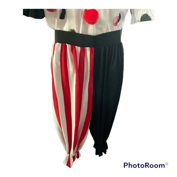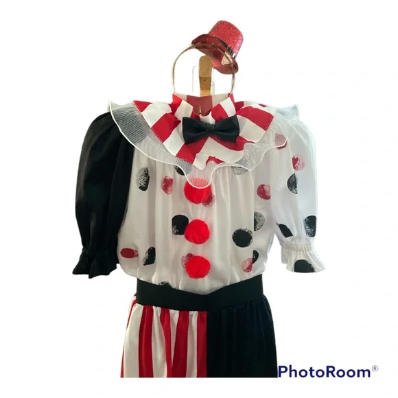 Handmade girls clown Halloween costume (could apparently pass for Harley Quinn as well as everyone seemed to think that’s who my daughter was when she wore it!). Includes top, pants, neck piece and little hat headband. Top and bottoms are very forgiving in size but I would say girls medium (10 - 12). Worn once. Great condition. Little hat has started to lose some glitter. (Additional accessories shown in last pic not included but shown for styling).