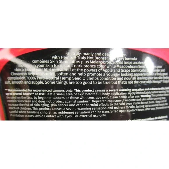 HEMPZ TRULY HOT TANNING LOTION 13.5 OZ TINGLE BRONZER W/APPLE & GRAPE STEM CELLS STRONG TINGLE LOTION FOR EXPERIENCED TANNERS ONLY!!!Fall truly, madly and deeper in love with Hempz® Truly Hot™ Bronzer. This fiery formula combines Skin Stimulators plus Melanobronze, that helps accelerate the melanin in your skin for instant dark bronze color while Meadowfoam Seed Oil gives your skin a kiss of youthful moisture. Let the powers of Apple and Grape Stem Cells plus Ginger and Cinnamon help moisturize, soften and help promote a younger looking appearance for a truly great complexion. 100% Pure Natural Hemp Seed Oil helps condition and nourish leaving your tan skin feeling soft, smooth and supple. Some things are too good to be true but that's not the case with Hempz® Truly Hot™. Features & Benefits: * DHA Bronzers with skin stimulators help provide immediate color that creates a hot tingle sensation for deeper, darker results. * Apple and Grape Stem Cells help protect and fight off the signs of aging while exposing radiant skin. * 100% Pure Natural Hemp Seed Oil hydrates, hydrates, nourishes and conditions skin. * Ginger and Cinnamon Extract help soothe and soften skin. * Meadowfoam Seed Oil helps your skin have a dewy, glowing appearance. * Aloe Vera * Erythrulose * Turmeric* 100% Vegan * Odor Shield Technology * Fragrance: Spicy BloomsWe are not responsible for claims from manufacturers to the results of products..