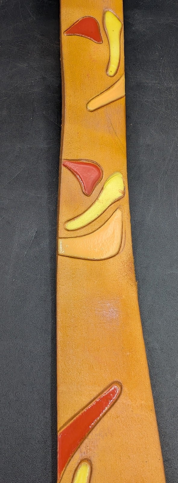 Vivid curry-yellow calf leather belt, hand made in Vigevano, Italy. Features hand-painted red, yellow and orange shapes with tooled surround. Solid brass buckle made in Italy. Features the signature hand stitched stick figure logo on the belt loop.