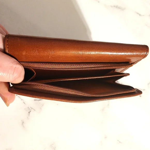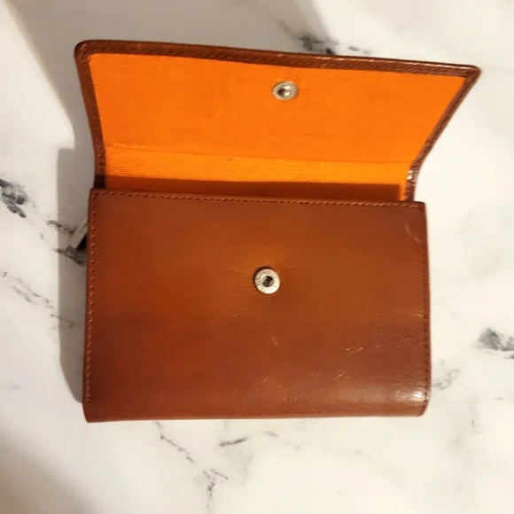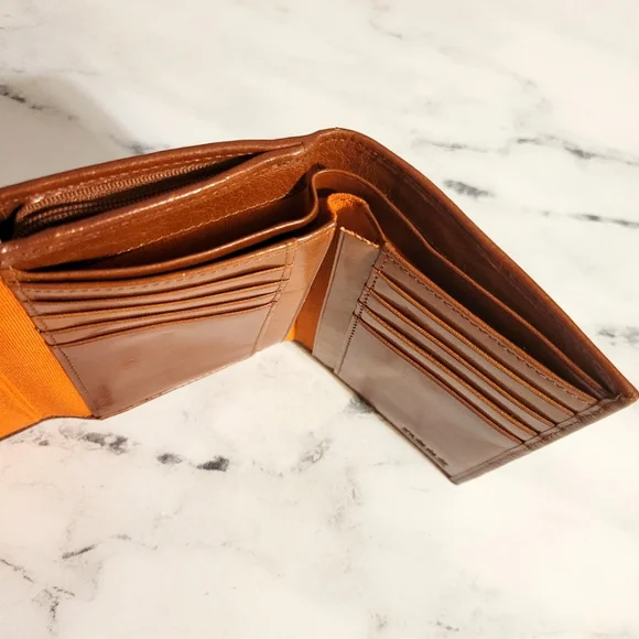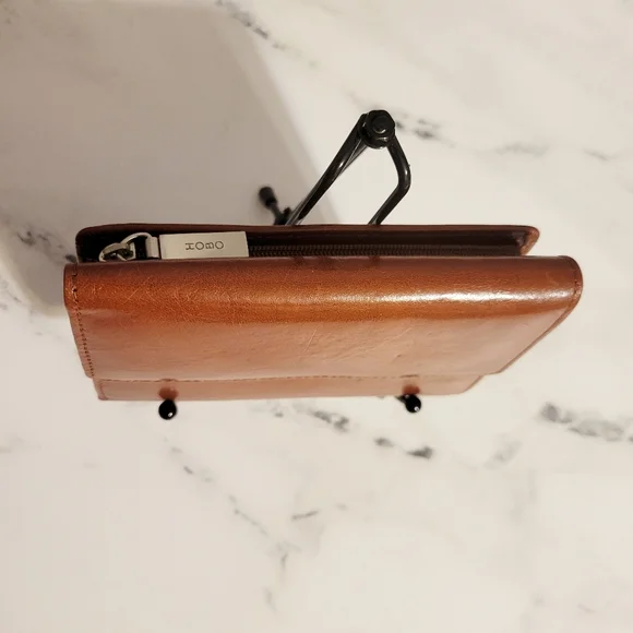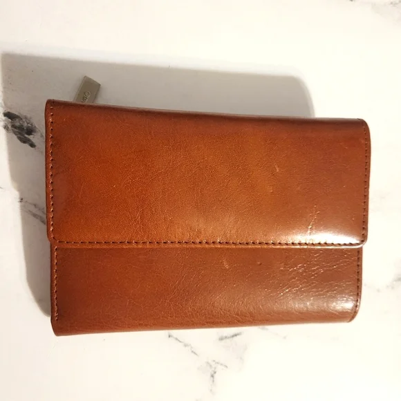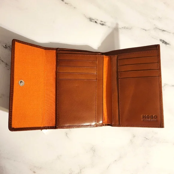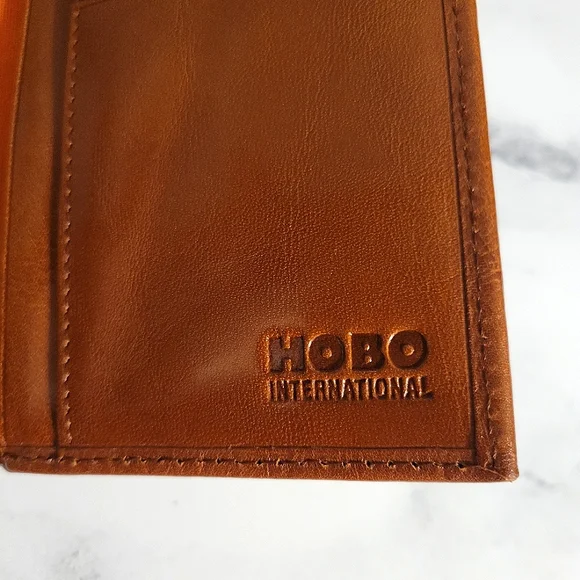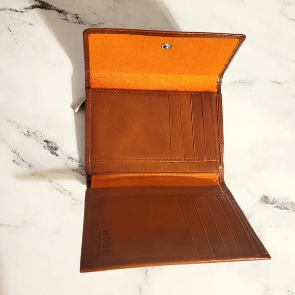 This HOBO International wallet is a dark caramel brown/burnt orange color with silver toned hardware. It's similar to their 'Jill' wallet with slight differences. Made with HOBO's signature buttery leather. On the top outer back is a zipper pouch with 2 divided compartments. The main body snaps open/close. Inside is 8 card slots, 4 slip pockets, & a divided bill-fold at the top. Mint Like New Condition! Appx 5.5"x4"x1" expandable.HW153