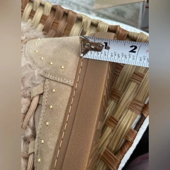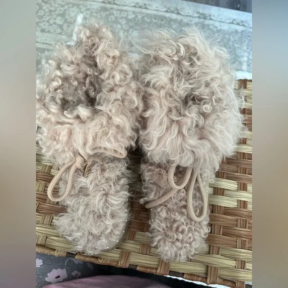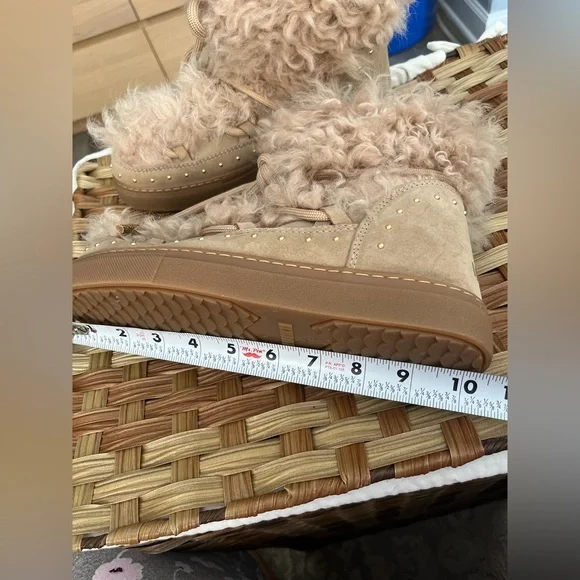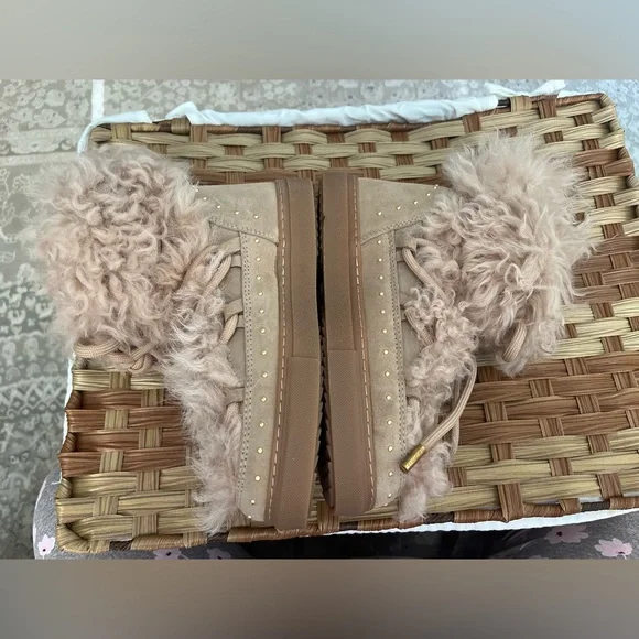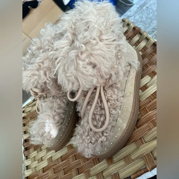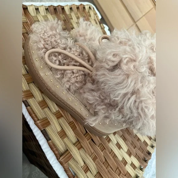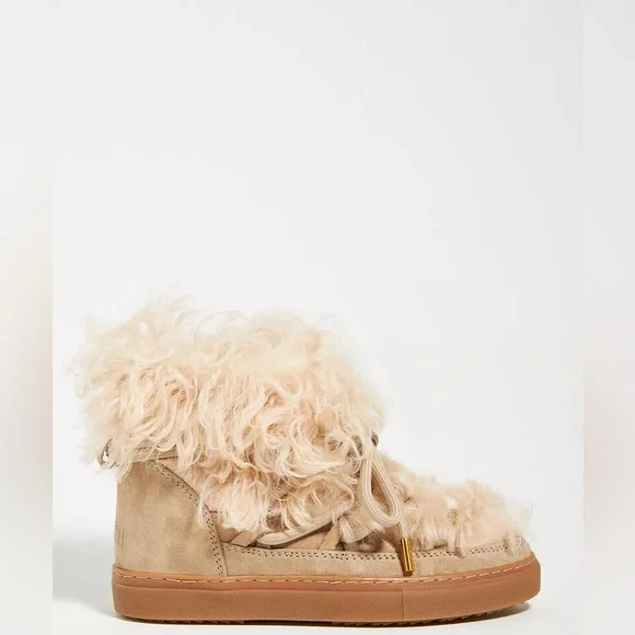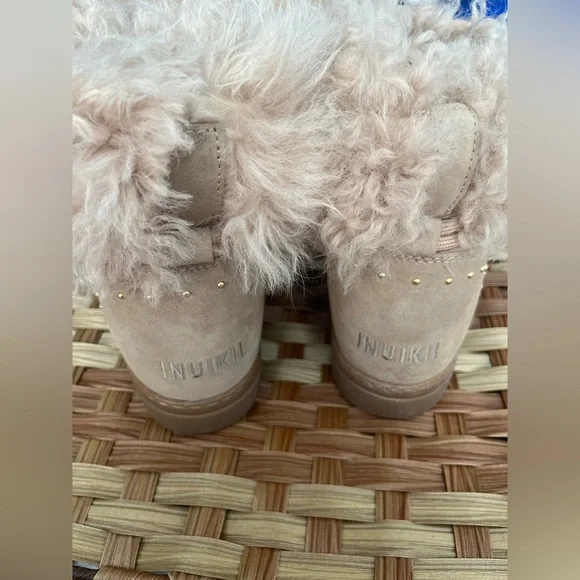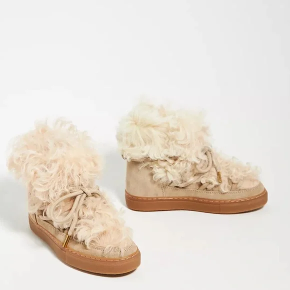 INUIKII Women's Long Curly Shearling water Repellent Wedge Sneakers Boots BeigeEU 38 US 7.5Like new condition Long Curly Boots for women by Inuikii in beige. Timeless design in combination with functional comfort distinguish this model. While the water-repellent as well as snowproof property creates a practical companion creates, the lambskin interior keeps you warm even on cold days. At the same time the model presents itself through the combination of curled lambskin and suede and discreet rivet applications in a fashionable look. presentation.• Runs smaller according to the size• Rubber sole• Loop lacingAlmond shaped cap• Logo embroideryDetailsCrafted of leather and plush and luxuiorous shearling, Inuikii's sneaker-inspired boots feature crisscrossed braided laces from toe to ankle. Shearling/leather upper Round toe Lace-up style Shearling lining Rubber sole Water repellent Fur type: Dyed shearling Fur origin:Portugal Made in Portugal SIZE Shaft height, about 1.5" Please note: This item runs small. Women's ShoesThese tan sneakers feature a cozy faux fur trim and a comfortable rubber sole, perfect for casual outings. The suede-like upper and moccasin-inspired stitching add a touch of style to these versatile shoes. Ideal for those seeking both warmth and fashion in their footwear.