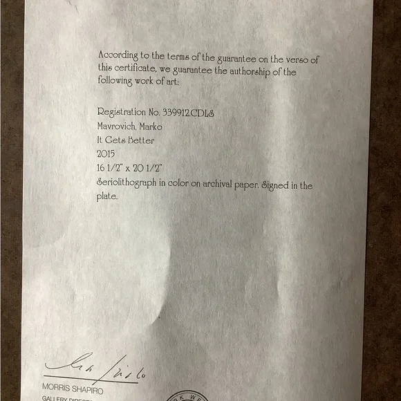 “It Gets Better,” Marko Mavrovich. Seriolithograph in color on archival paper. Signed in the plate. Art measures 16 1/2 x 20 1/2 not including the white edge. Will be shipped rolled up.Marko Mavrovich, a California-raised painter of Croatian descent, vividly captures the essence of the sea in his art.His tranquil paintings of seascapes and light colors are a result of growing up near the Pacific Ocean and the Adriatic Sea. Practical and resourceful, Mavrovich draws from what he knows—the seascape of the world.Mavrovich’s art has been exhibited around the globe
