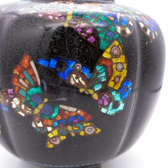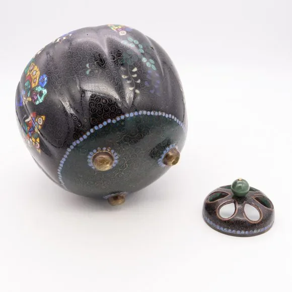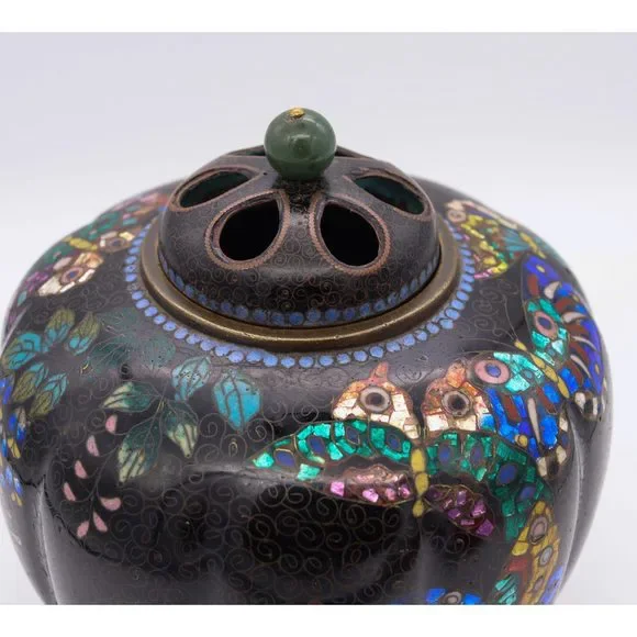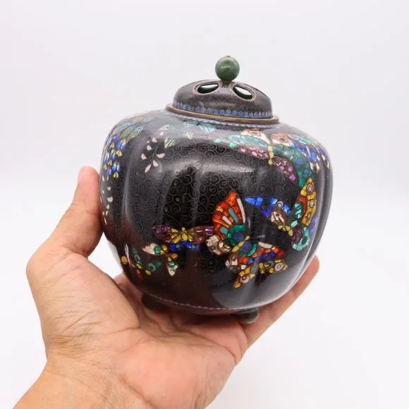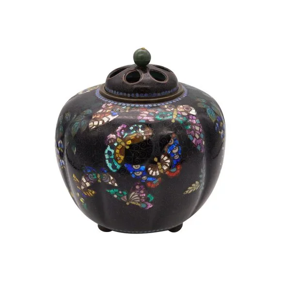 Japanese Koro from the Meiji Period (1868-1912).Beautiful antique ten sides fluted koro censer, created in Japan during the Meiji period (1868-1912), circa 1890's. It was carefully crafted in solid bronze with copper wires and embellished with applications of polychromatic cloisonne enamel with silver and gold flakes, depicting organics and natural motifs such butterflies and flowers.The lid on top is embellished with a sphere of 13 mm carved from natural green nephrite jade.Has a total weight of 360.7 Grams and a measurements of 134 mm by 127 mm (5.25 x 5 Inches).Meiji period, is an era of Japanese history that extended from October 23, 1868 to July 30, 1912.The Meiji era was the first half of the Empire of Japan, when the Japanese people moved from being an isolated feudal society at risk of colonization by Western powers to the new paradigm of a modern, industrialized nation state and emergent great power, influenced by Western scientific, technological, philosophical, political, legal, and aesthetic ideas. As a result of such wholesale adoption of radically different ideas, the changes to Japan were profound, and affected its social structure, internal politics, economy, military, and foreign relations. The period corresponded to the reign of Emperor Meiji. It was preceded by the Keiō era and was succeeded by the Taishō era, upon the accession of Emperor Taishō.Koro, is a Japanese censer, incense burner, perfume burner or pastille burner is a vessel m