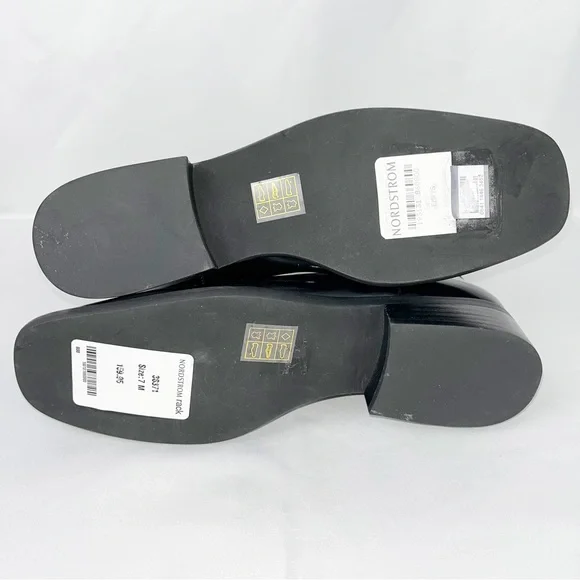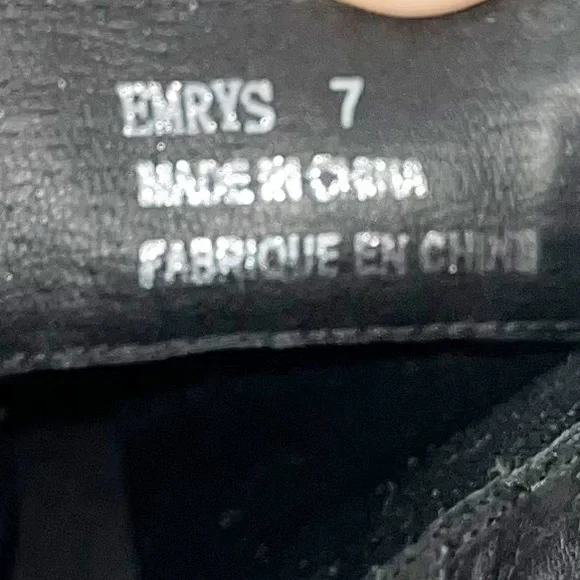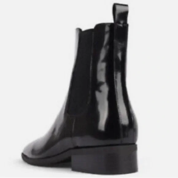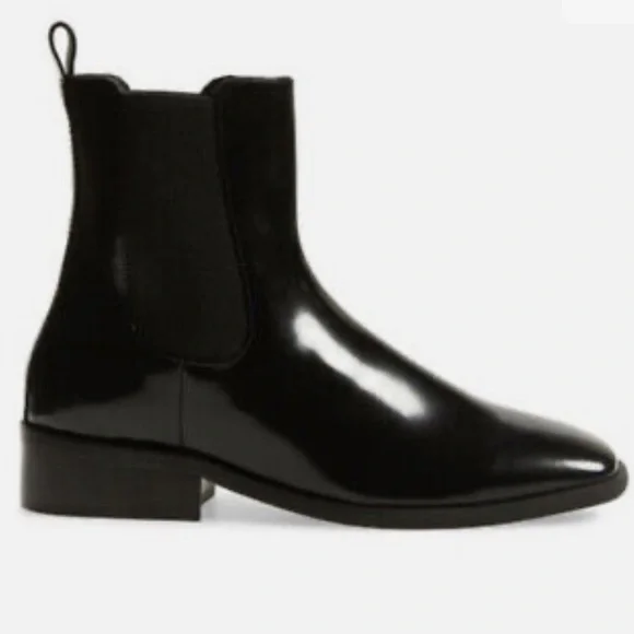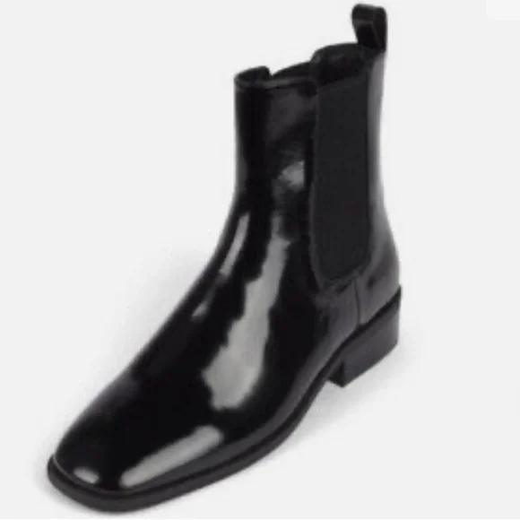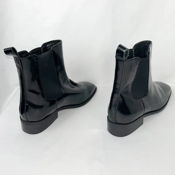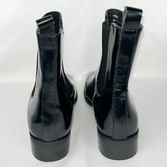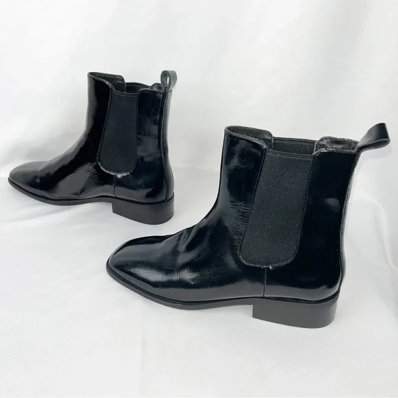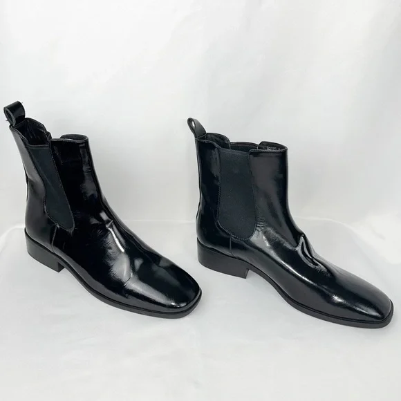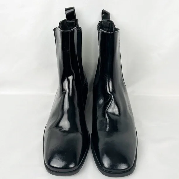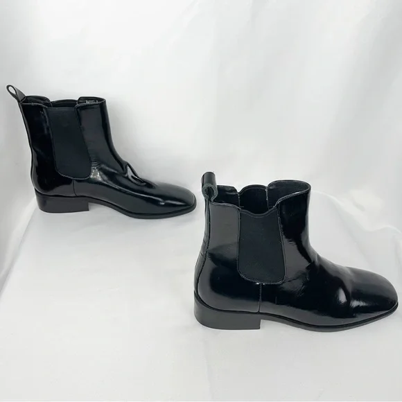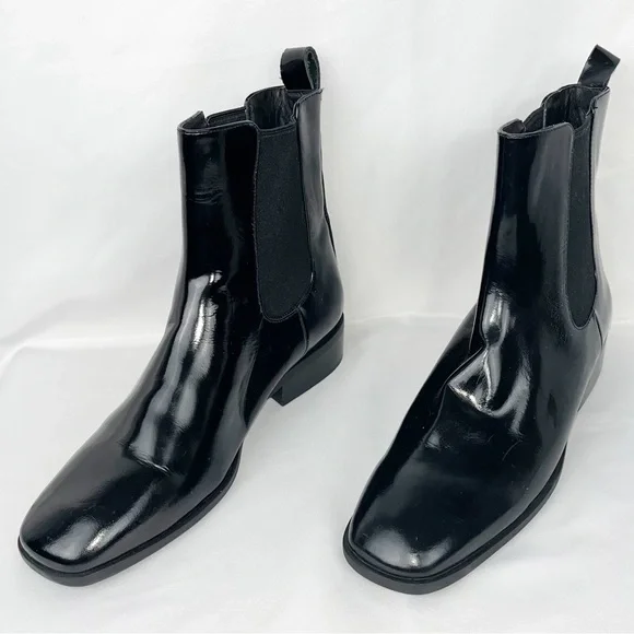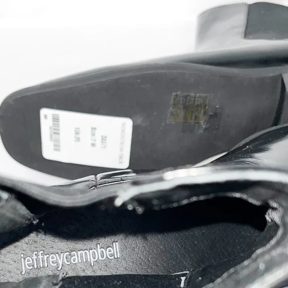 Jeffrey Campbell Emrys Black Patent Leather Chelsea Boots Sz7 NWOB The Jeffrey Campbell Emrys chelsea boot is designed with a simple square-toe will add a sleek and sophisticated touch to any outfit.1.15" heel 5.57" shaft, 10" leg opening Leather Upper, Leather Lining, Synthetic Sole. Has been in retail environment and left side has creased top of foot.