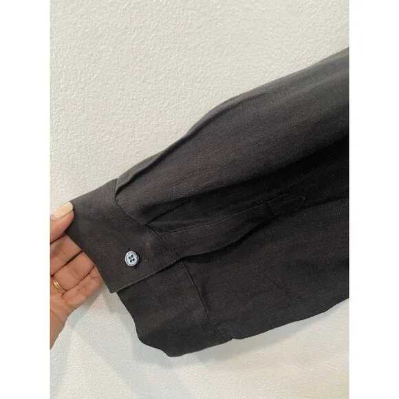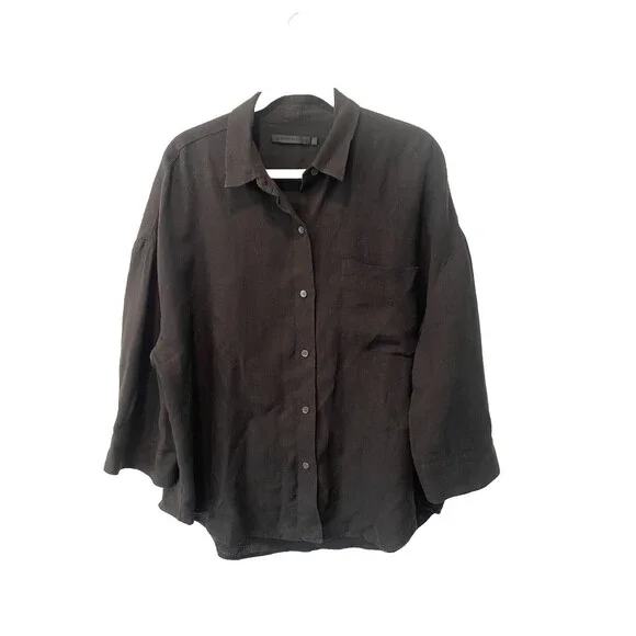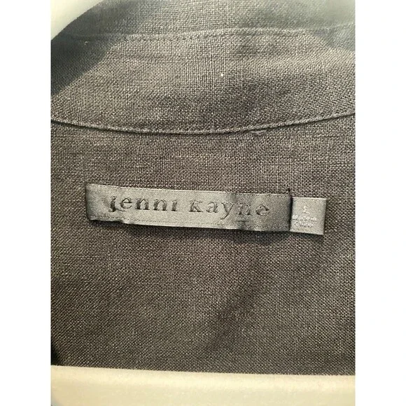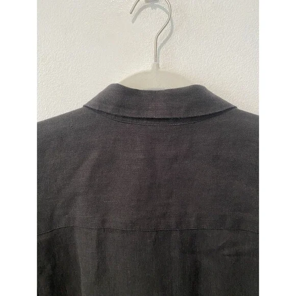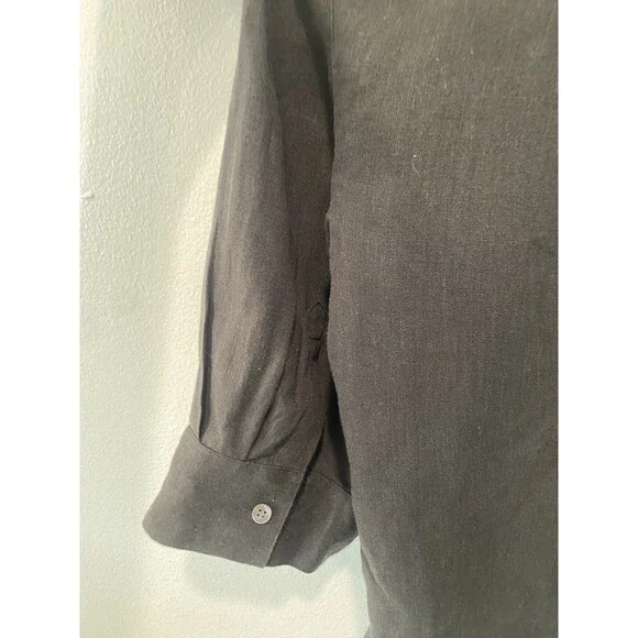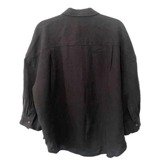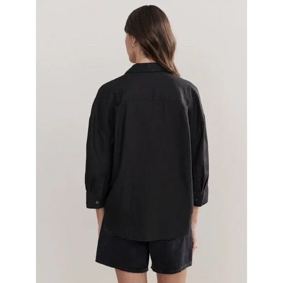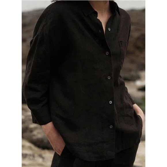 The JENNI KAYNE 100% Linen Logan Shirt in black is a minimalist and contemporary piece perfect for a capsule wardrobe. With a relaxed fit and drop shoulder sleeves, this button-up shirt features a collared neckline and is made of breathable linen material. Ideal for all seasons.Relaxed and light-as-air, this boxy-fit button-up is our answer to effortless style in any season.100% linen.Features drop shoulder and three-quarter sleeves.Hand wash cold with non-chlorine bleach when needed, reshape and lay flat to dry.Cool iron if needed or dry cleanExcellent conditionRetails for $295