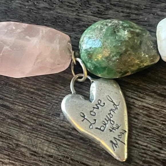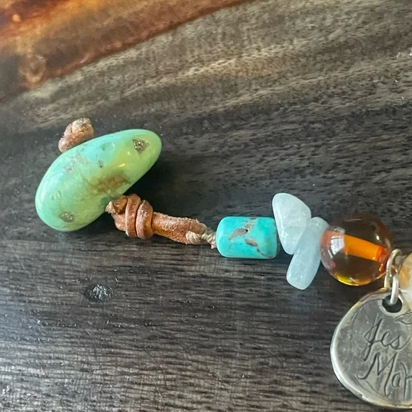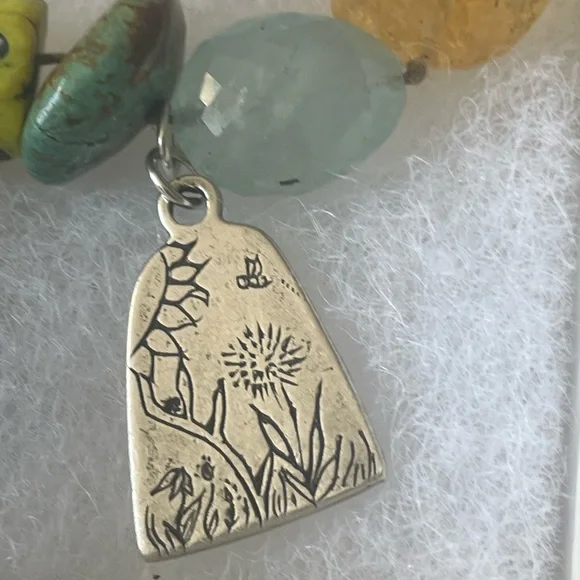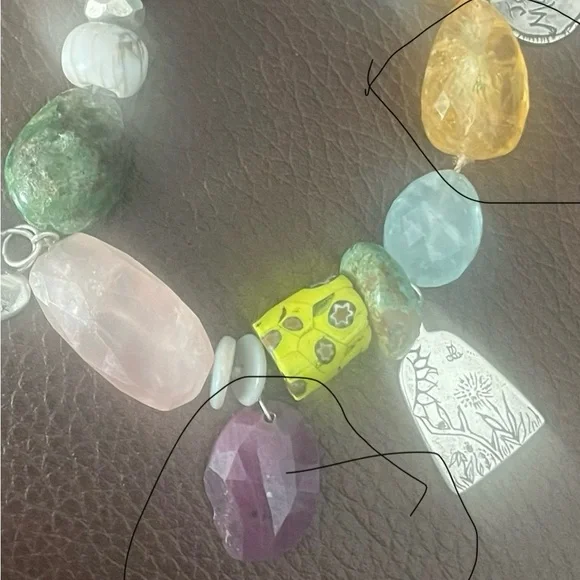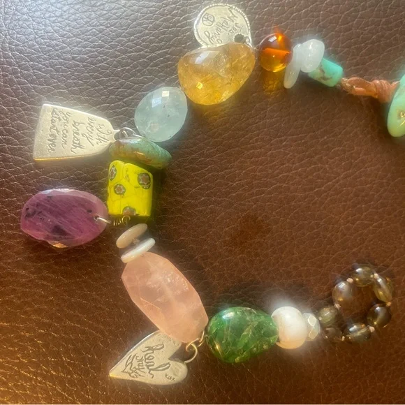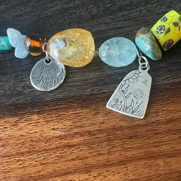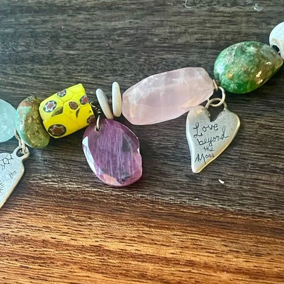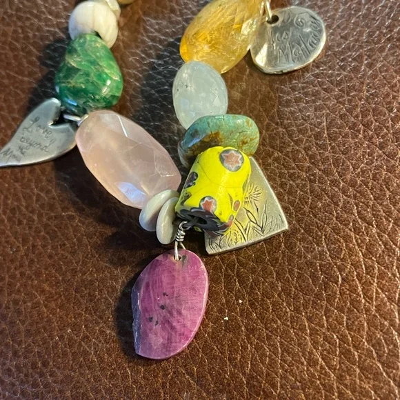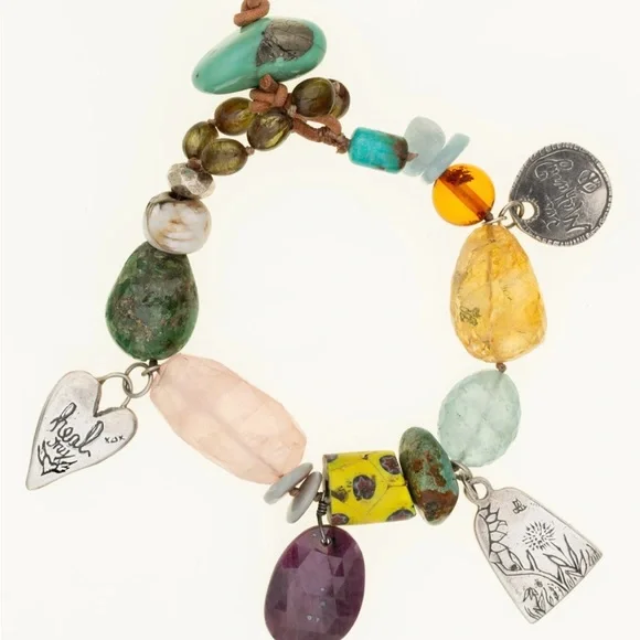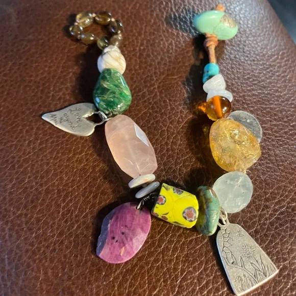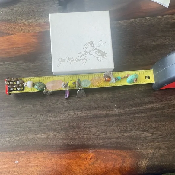 This is a really beautiful bracelet i bought for myself from Jes Maharrys studio..my wrist is 7” and bracelet was loose at 8”,I wore 1x and it fell off and chipped purple stone and small scratch on yellow stone.you can’t tell unless you know it’s there.Price reflects it.its signed with beautiful sterling silver charms and treasure trove of Jewlels and trading breads.