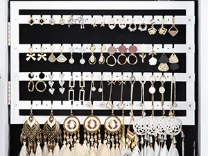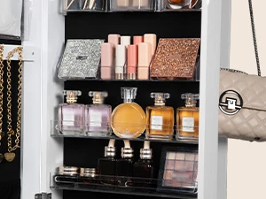 1. 【Ample Storage Space】With 60 earring slots, 32 stud holes, 36 ring slots, 20 necklace hooks, 3 bracelet bars, 5 storage racks with acrylic lip sticks and brush storage boxes, 2 dust-proof storage pockets, and 2 black mask pockets. Our jewelry armoire provides plenty of space to keep all your jewelry organized and easily accessible.