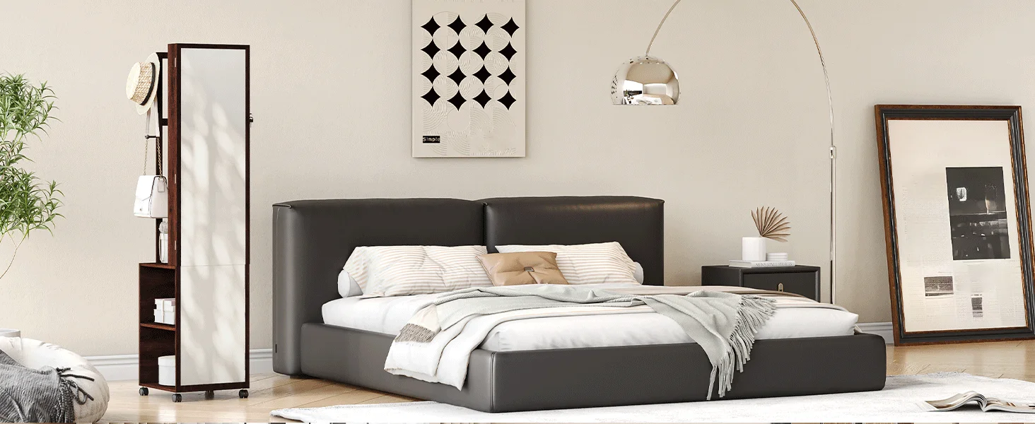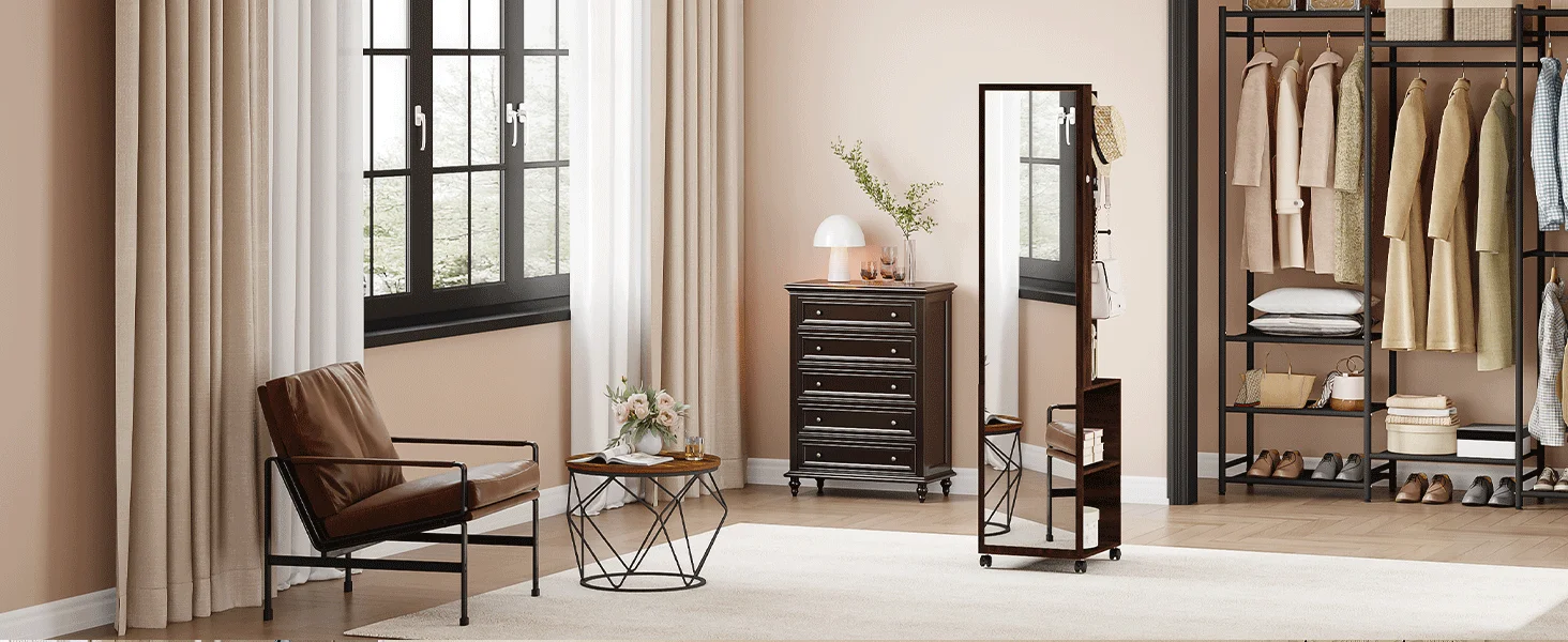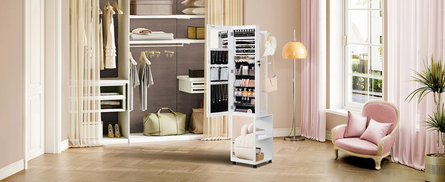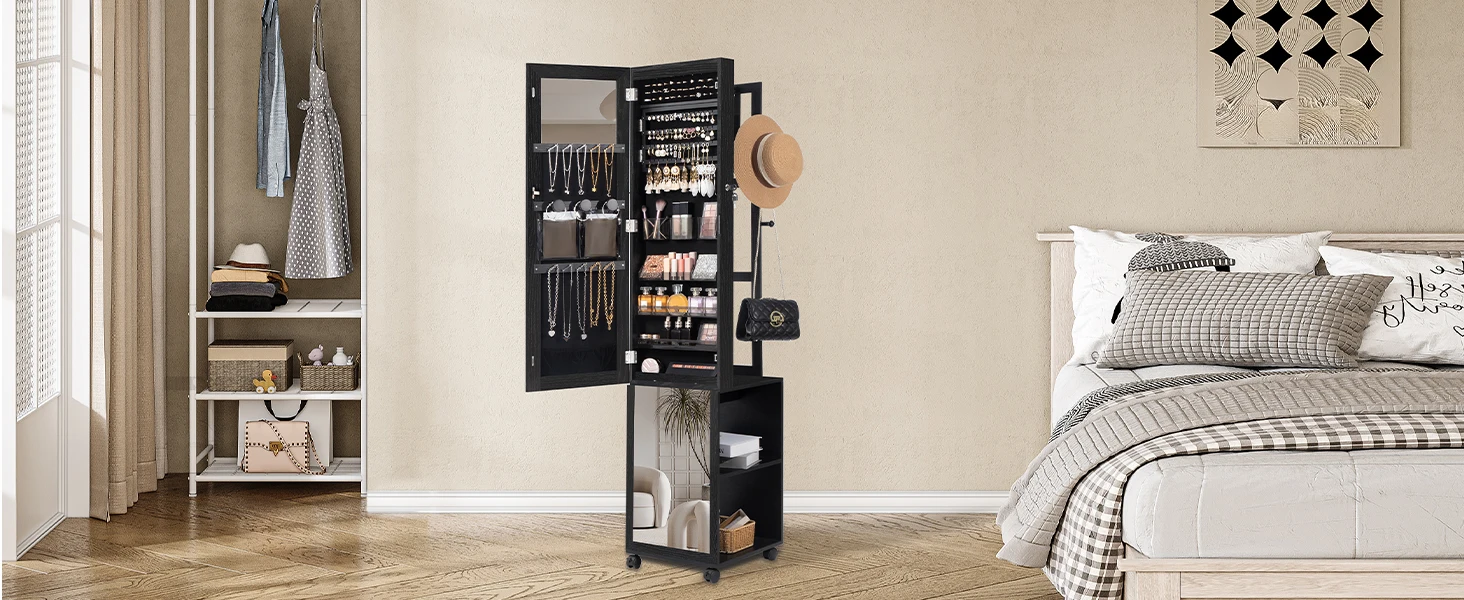 2. 【5-in-1 Space Saving Solution】Get a jewelry organizer, full length mirror, bottom shoe mirror, vanity mirror, and 3-tier storage shelves, a garment rack, all in one stylish package. Finally, your jewelry, your makeup, your bags, your clothes have their own storage space in one place.