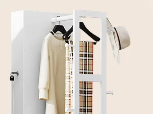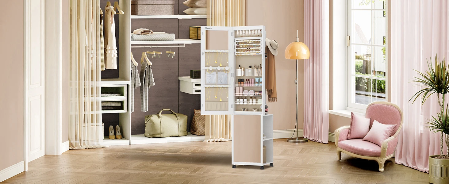 7. 【What You Get】 A standing jewelry cabinet with a full-length mirror, a garment rack on the back, various storage solutions for both jewelry and cosmetics, a lockable design with 2 keys, and clear instructions for easy assembly.