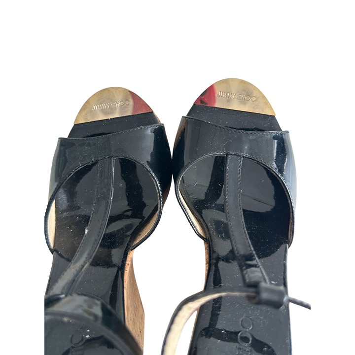 Elegant Jimmy Choo black patent leather wedges with a stylish cork sole. Perfect for any occasion, offering a chic and sophisticated look. Ideal for those who appreciate high-end fashion.
