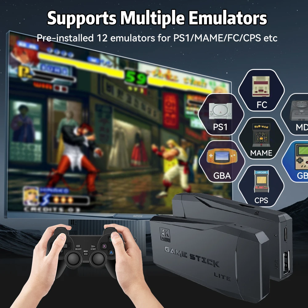 The M8 game stick is pre-installed with 12 emulators such as PS1/MAME/FC/CPS and a rich collection of games. Come and experience the fun of gaming!