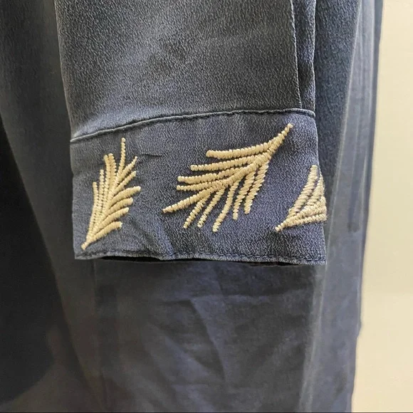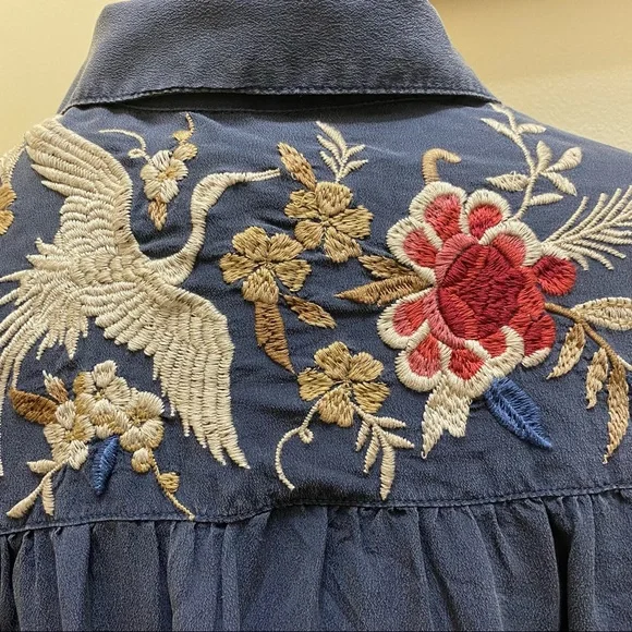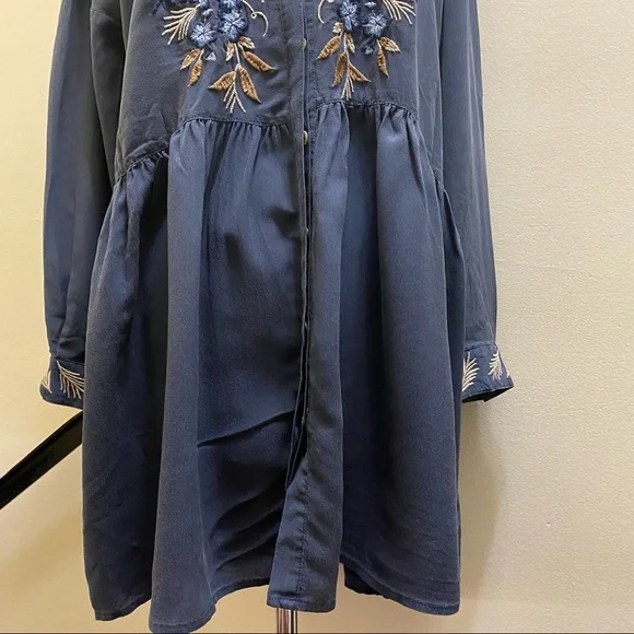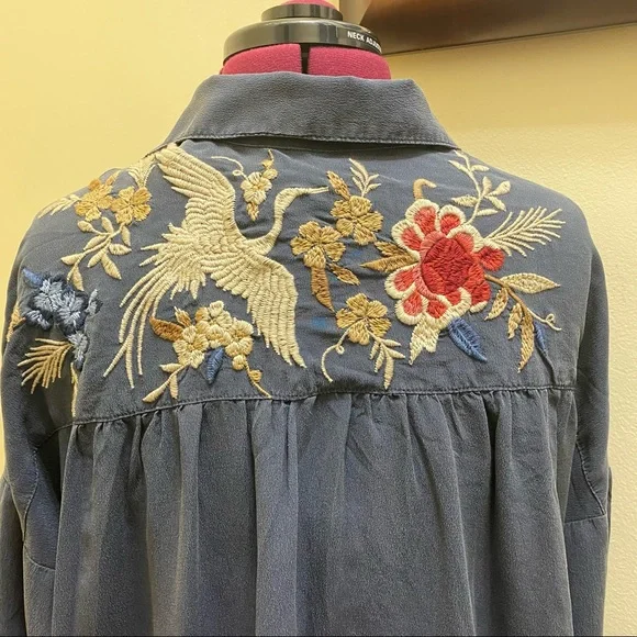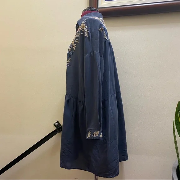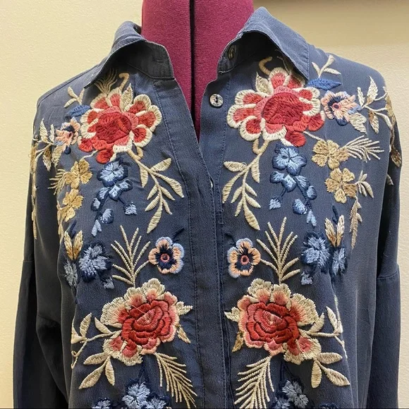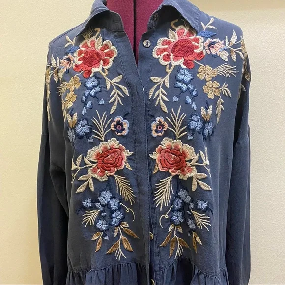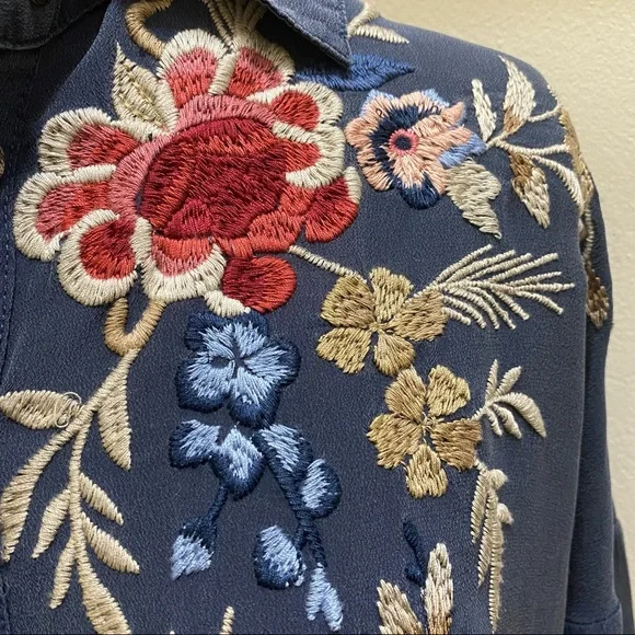 Boho-inspired Palmyra Smock Shirt Tunic by Johnny Was is elevated by its classic cut and chic floral embroidery throughout. Perfect for any occasion, effortlessly dress this top up or down with dark-washed skinny jeans or simple leggings and a silk scarf or layered jewelry. Add your favorite leather booties or flats to complete the look.SIZE: Small COLOR Slate FABRIC CONTENT 99% Cotton / 1% spandexCARE INSTRUCTIONS Machine wash cold, no bleach