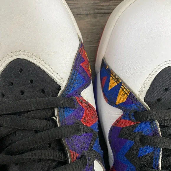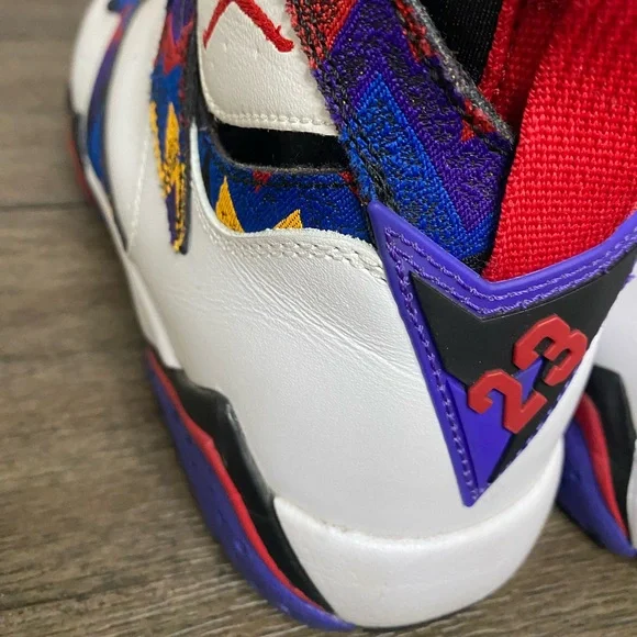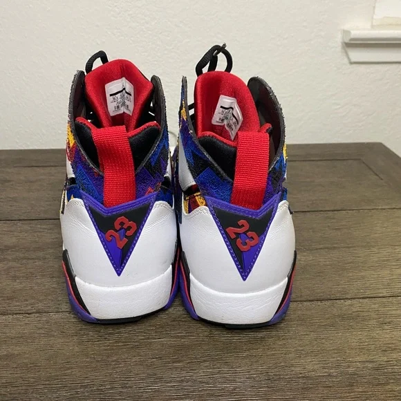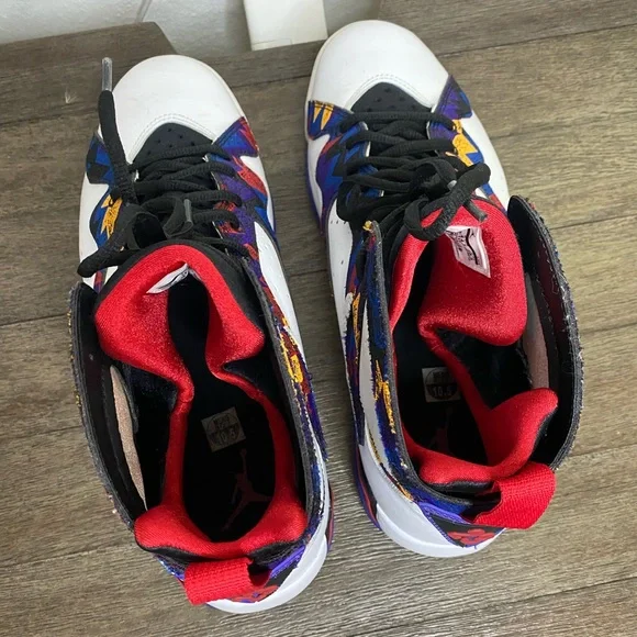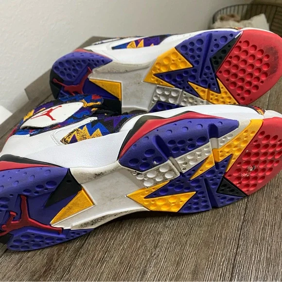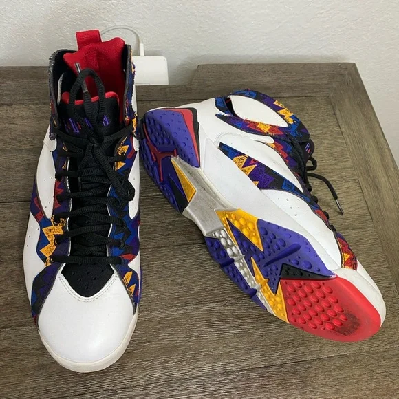 The Air Jordan 7 Retro 'Sweater' draws inspiration from an outfit worn by Michael Jordan at the 1992 Barcelona Summer Olympics and in a 1993 McDonald's Super Bowl commercial with Larry Bird. Also known as the 'Nothing But Net,' the 2015 release combines a vibrant graphic design with upper white leather, black, University Red, and Bright Concord tongue, heel, and outsole accents.Size 10.5 Has some crease but nothing to crazy. (See photos) Shoes have only been worn a handful of times