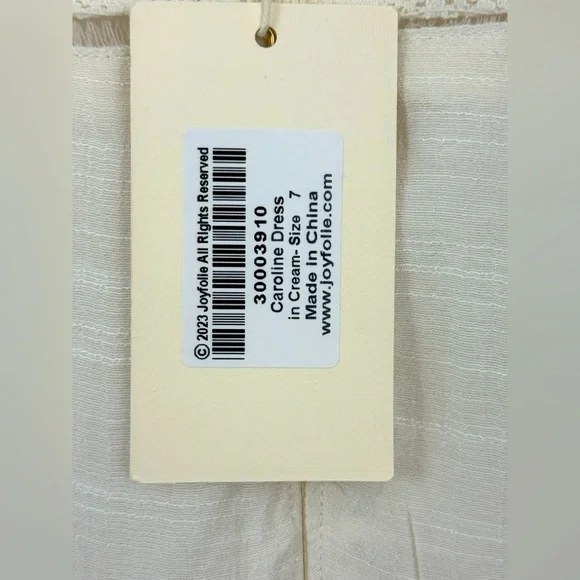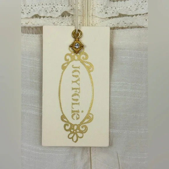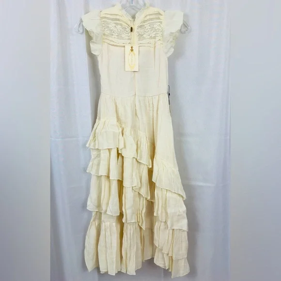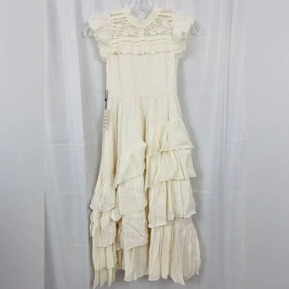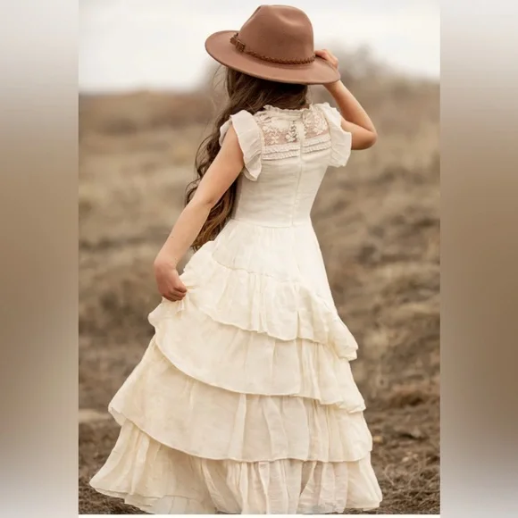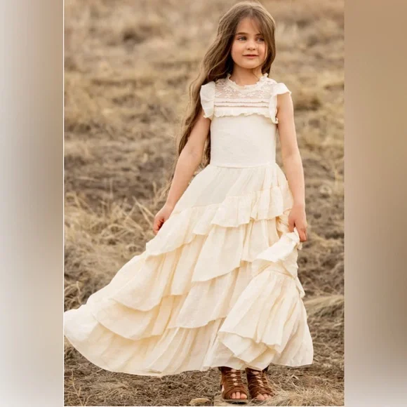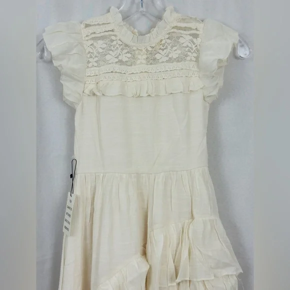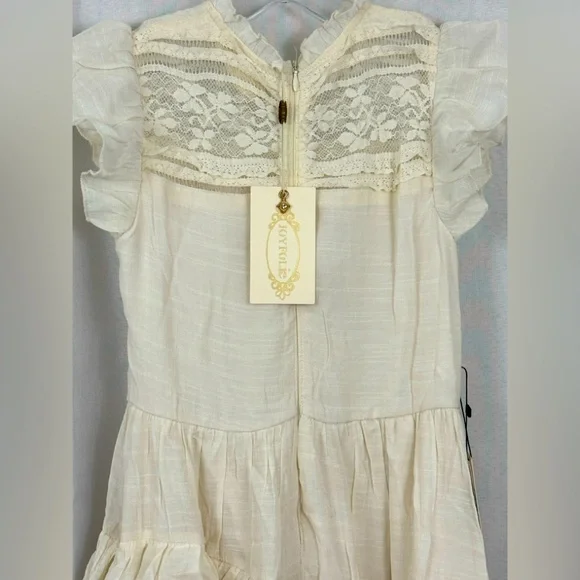 JOYFOLIECaroline DressColor - CreamSize - Girls 7Timeless and elegant, this maxi dress features flounced, cap sleeves, a high lace neckline, and cascading tiers of asymmetrical ruffles. Flounced cap sleevesHigh lace necklineCascading tiers of asymmetrical rufflesInvisible zipper at center backFully linedSelf : 65% cotton, 35% polyester // lining : 100% polyesterMachine wash cold (inside out), line dryBeautiful cream dress with ruffled layers. Perfect for special occasions.New with tags !