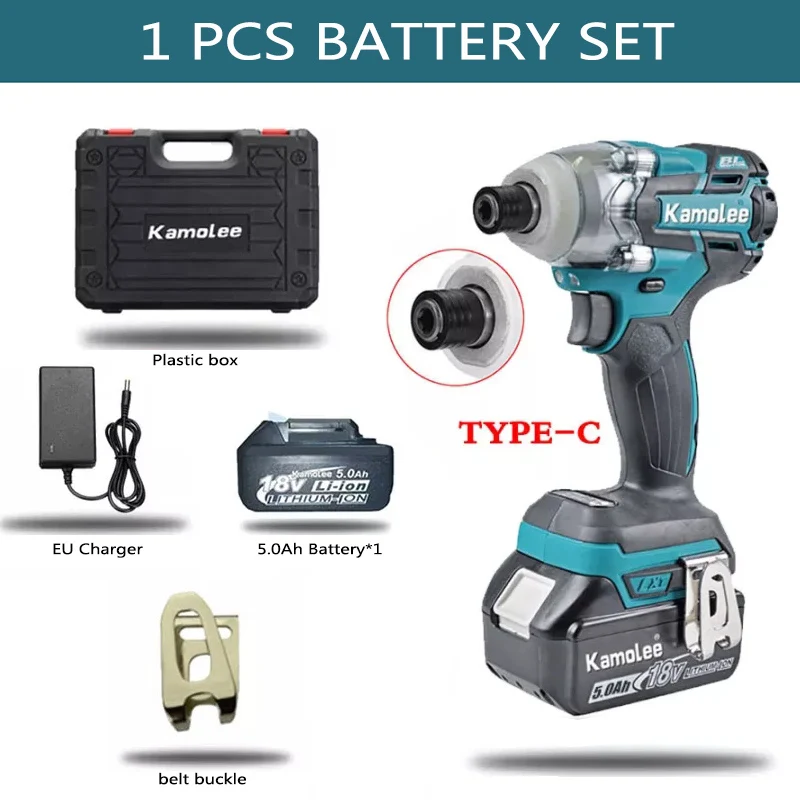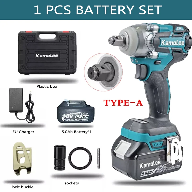 *Plastic box set:electric wrench × 1, 5.0Ah battery × 1, charger × 1, screw connector × 1(only TYPE A/B Included),belt buckle x 1,suitcase × 1