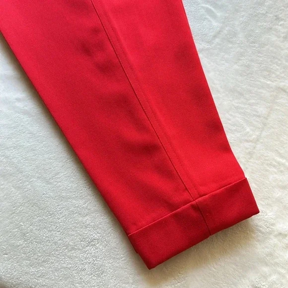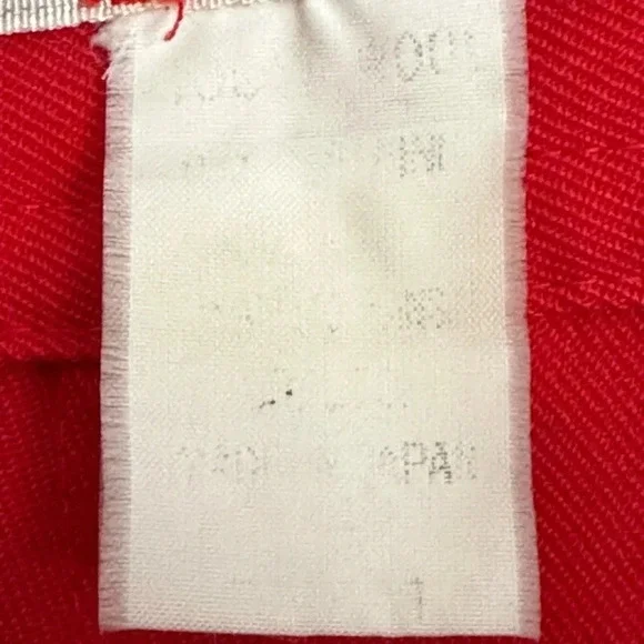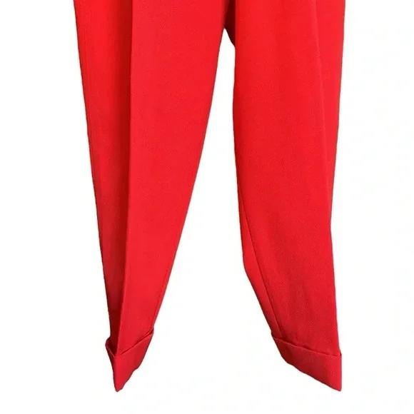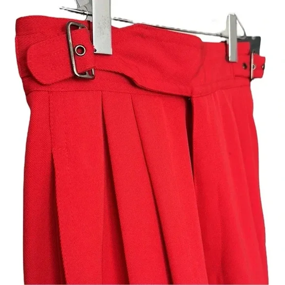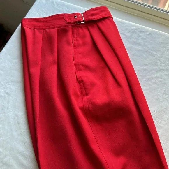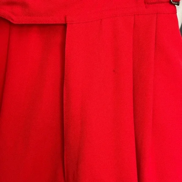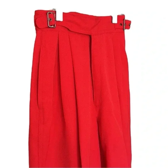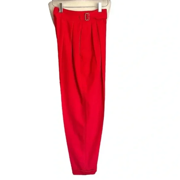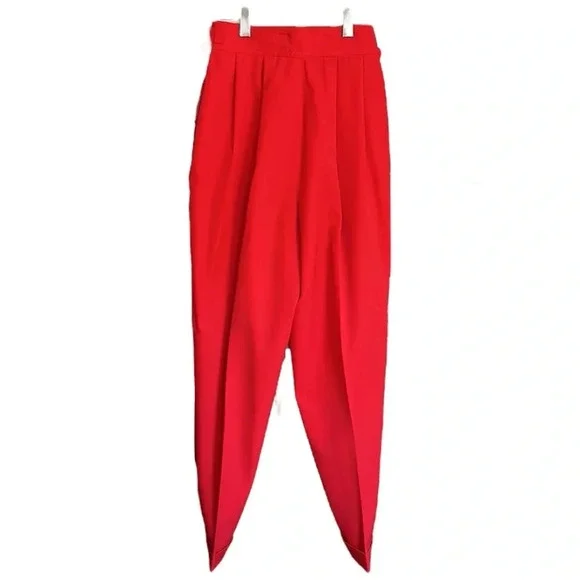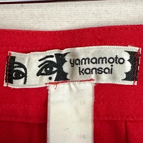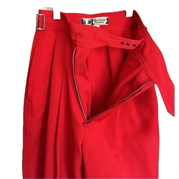 Kansai Yamamoto Vintage Pants Trousers 80sNew Wave Ribcage Red Baggy Bold early 80s super high rise, pleated, baggy statement pants. The waist fits up around your ribs. The hips and thighs are very wide, and the legs taper at the ankle. Zip fly with 2 side buckle closureHand pockets Pleats on front and back Cuffed hemsGood vintage conditions. Please review photos. There is a small spot on the left front and a faint spot on the right thigh. No other flaws noted except the size and fabric tag is faded and unreadable. I believe it to be a modern size 4/25Approximate flat lay measurements Waist 11”Hips 22”Rise 14.5”Inseam 28”Parachute, barrel, party, designer, Japan, Japanese, luxury, designer, high end