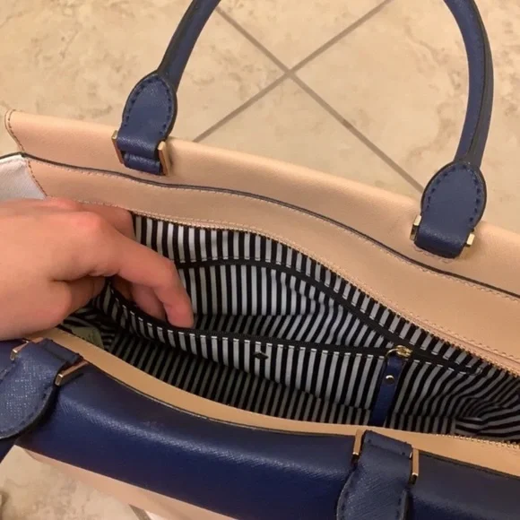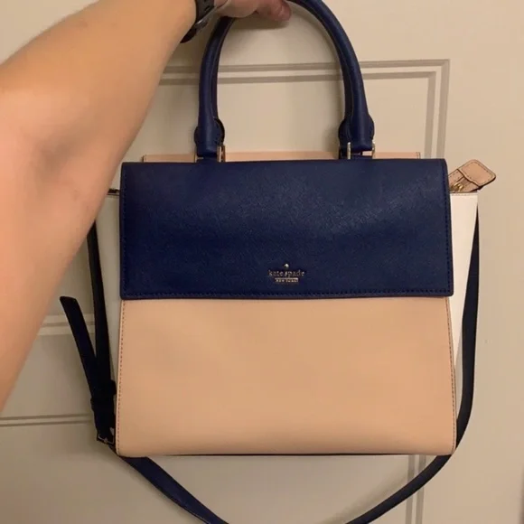 This Kate Spade Cameron Street Blakely SatchelThe colorblock adds that extra pop of color for any outfit.Plus it’s earth tones have just enough neutrality that it’s perfect for everyday use and easily fits an iPad or tablet.Plus so many secured compartments is a busy woman’s dream.Only wore it for about 16 hours.Reasonable offers accepted.SIZE8.6" h x 12.7" w x 5.9" ddrop length: 5" handle, 20" crossbodyMATERIALcrosshatched leather with matching trimbookstripe printed on poly twill lining14 karat gold plated hardwarestyle # pxru6409DETAILSsatchel with zip top closure and optional crossbody strapinterior zip and double slide pockets, exterior flap pocketkate spade new york gold embossed signature with studColor: Drifting sand / bright white / ocean blue
