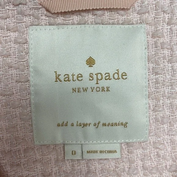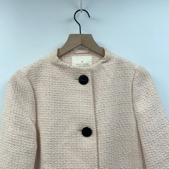 Great preowned condition!Kate Spade New York PeacoatSize: 0-Long sleeves-Collarless -Four button closure-Two front slant pockets-Light pink boucle tweed-Cotton, acrylic, other fibers Approximate measurements laying flat...Shoulder to hem: 34"Armpit to armpit: 18.5"Waist: 19"All reasonable offers are considered :)Ships next business day!Bundle with 1+ items and automatically save 25%