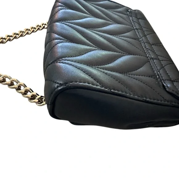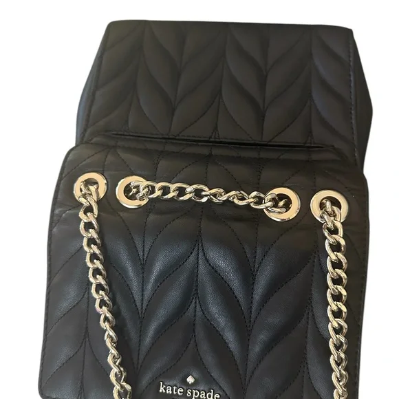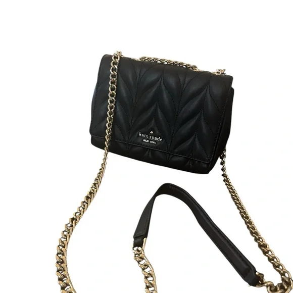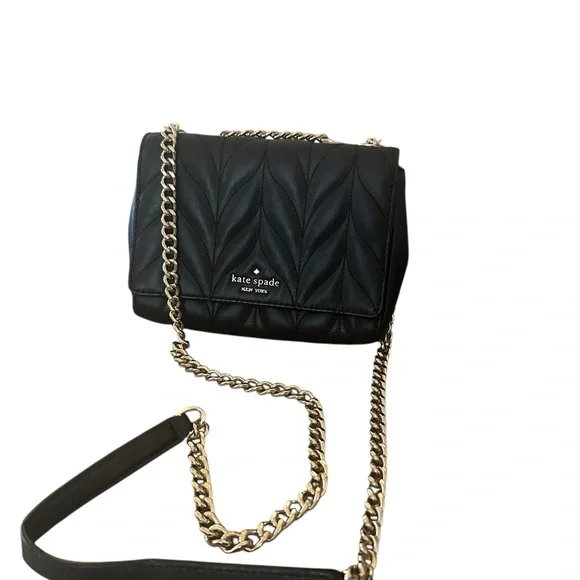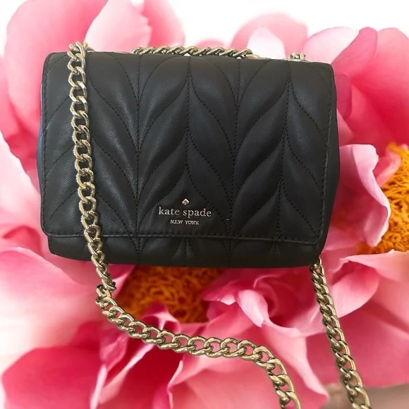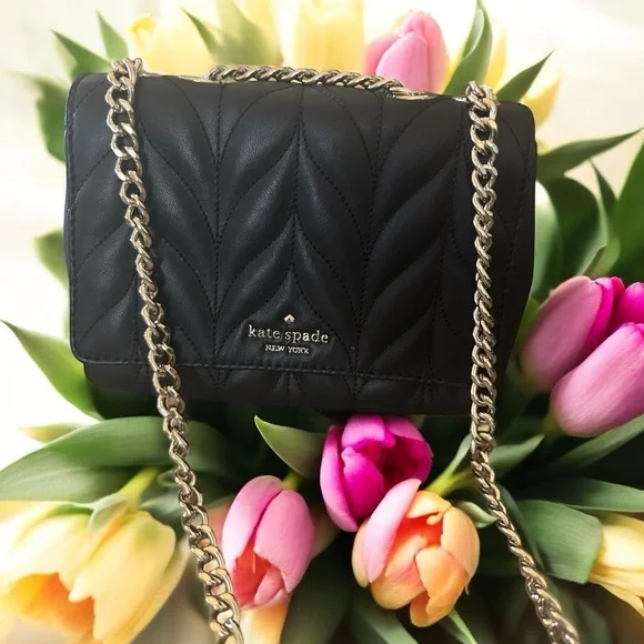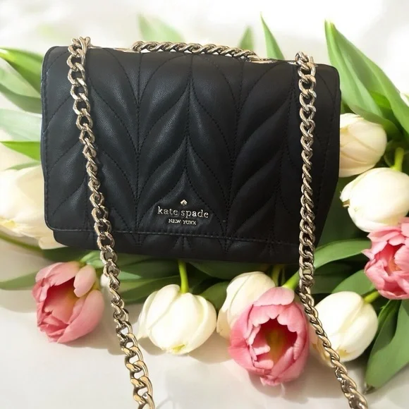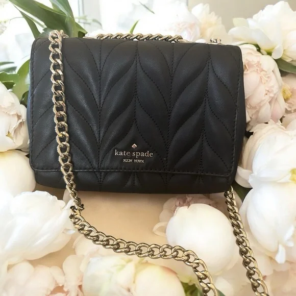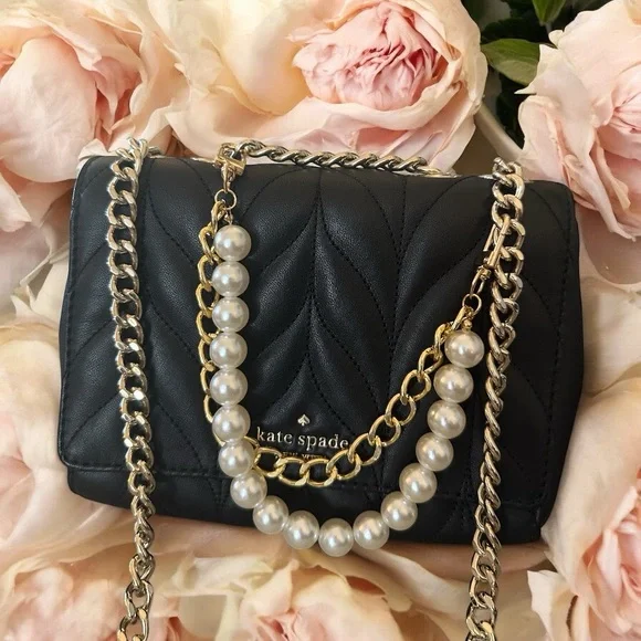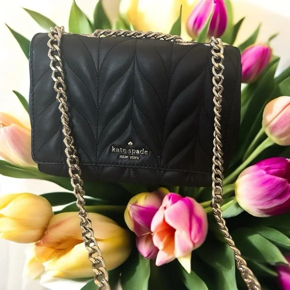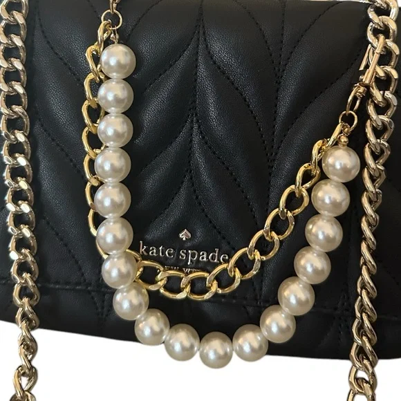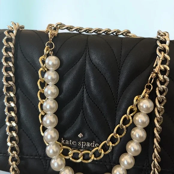 Classic Kate Spade Black Smooth Leather Quilted Briar Lane Emelyn Shoulder Bag. Featuring a chic design and elegant gold chain accents, this bag is perfect to dress up any outfit. Pin mount gold kate spade New York logo on an envelope style front flap with a magnetic snap clasp and a hidden back pocket. Please not Kate spade New York is the top of the line for the brand. The lining is iconic double jacquard black spade lining with one large slip pocket. Approximately 7.5 x 5.5 x 2 inches with 22 inch drop. The pearl and chain charm is not for sale - used to show the versatility of styling this bag. This style was available in late 2024 - sold out now. In like new condition. I ship on Saturdays & Wednesdays. Smoke and pet free home.