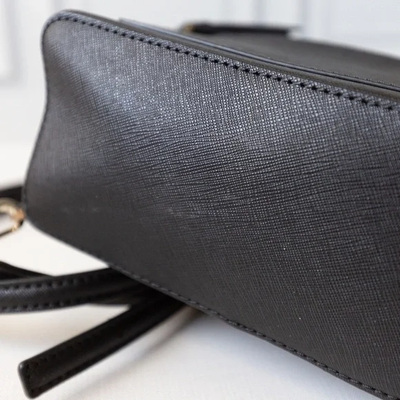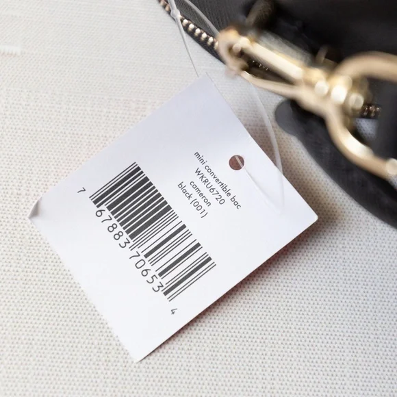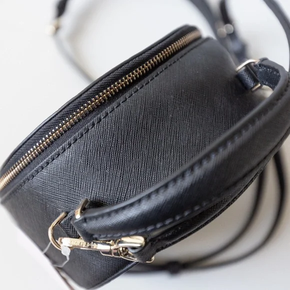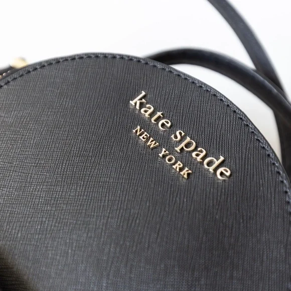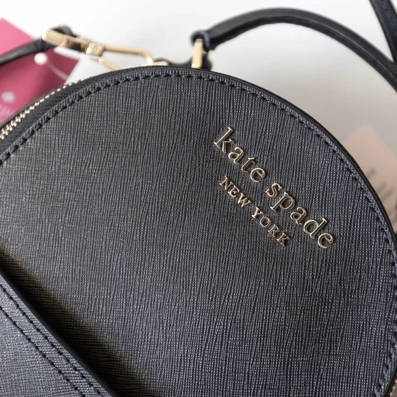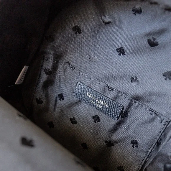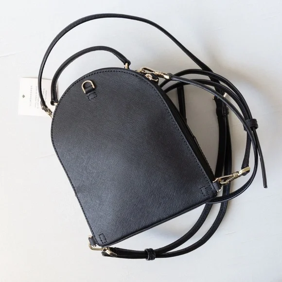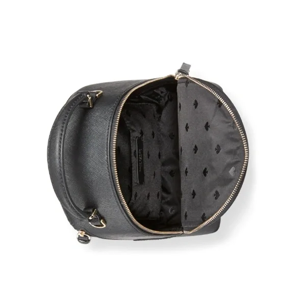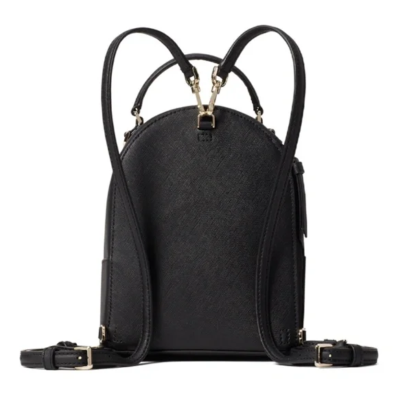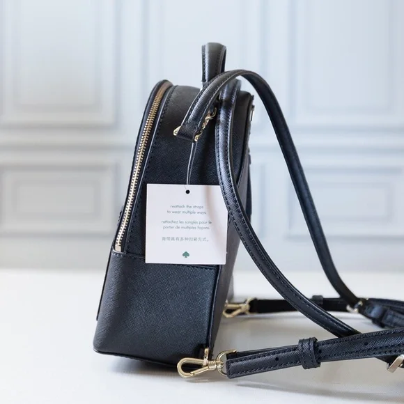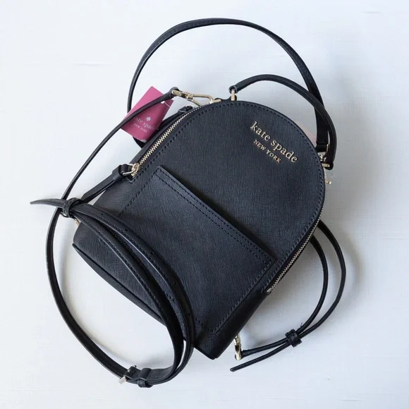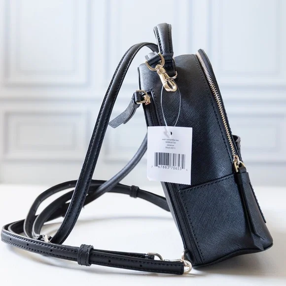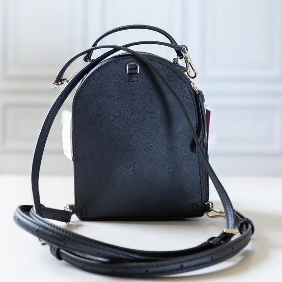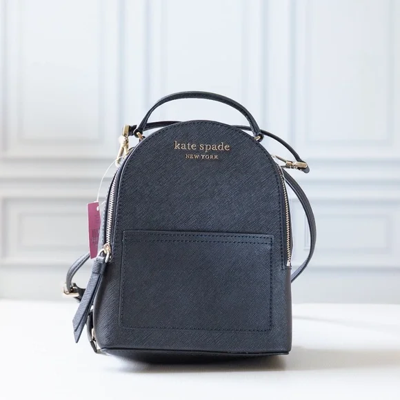New with tags (NWT) Kate Spade Cameron Mini Convertible Backpack in Black SaffianoMiniature backpack with zip closure, top handle, detachable and adjustable straps, interior and exterior slip pockets, black interior with spades print and gold logo and hardware on exterior.Originally $289MINOR CALLOUTS: There are a few tiny white dots on parts of the backpack, mainly on the top and bottom, as well as what looks like a scuff on the bottom. These may be able to be removed by the buyer, but I cannot guarantee they are removable.Style #WKRU6720Approximate Measurements: 8" (H) x 6.8" (W) x 3.8" (D)Item comes from a pet-free, smoke-free home.