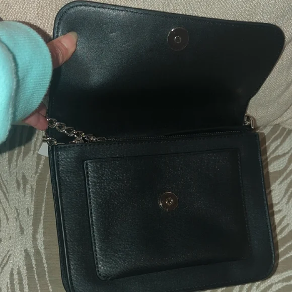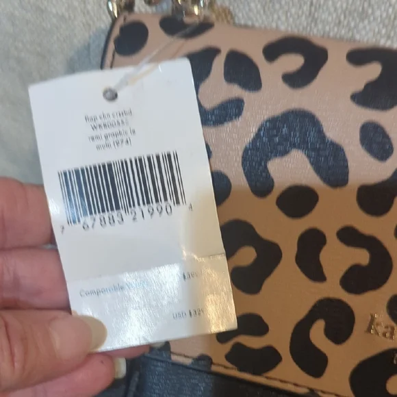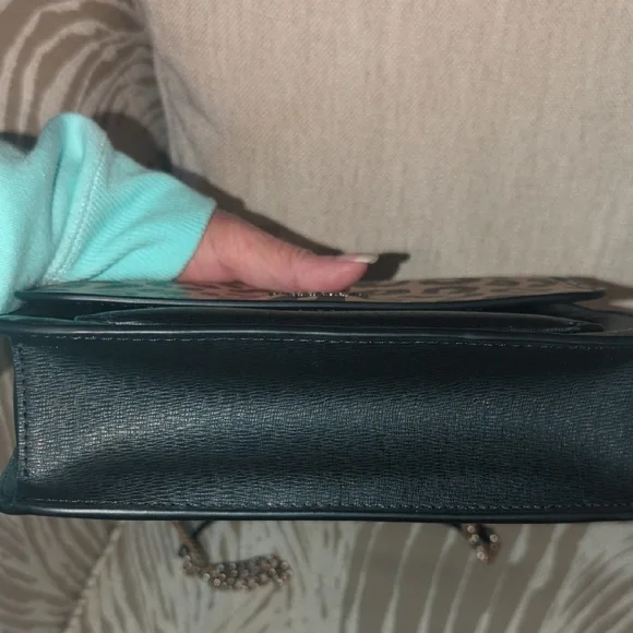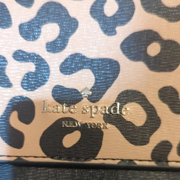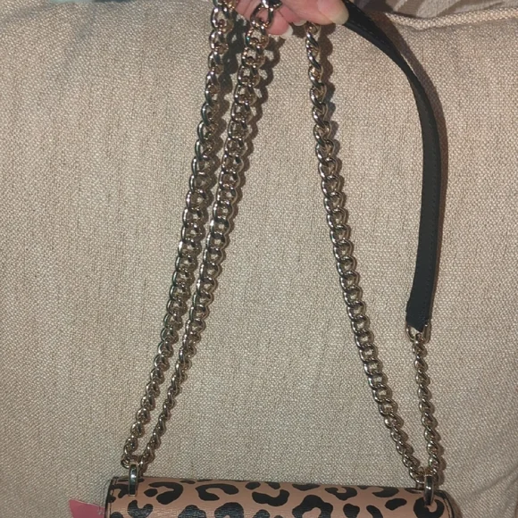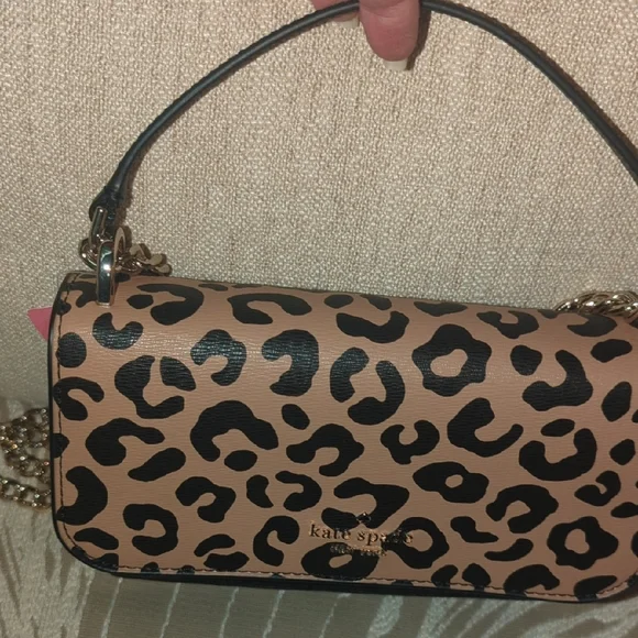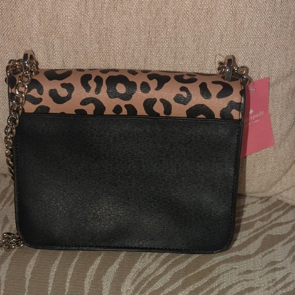 Stylish and chic, this Kate Spade bag features a striking leopard print design with a classic black base. The strap is chain and leather. It adjusts from a crossbody to a top handle and shorter crossbody length. There are 3 ways to adjust the strap. Perfect for adding a touch of elegance to any outfit. $329 retail Pocket on the outsideZippered compartment on the inside open compartment on the inside open compartment on the back of the purse Gold hardware NWT No Callouts See pictures Ask questions all sales are final