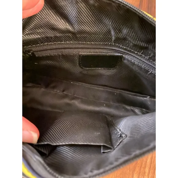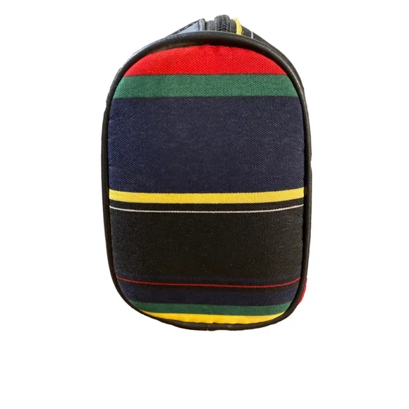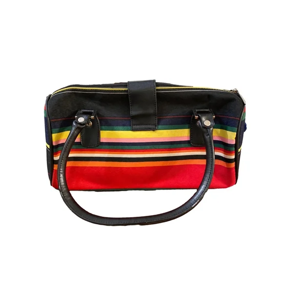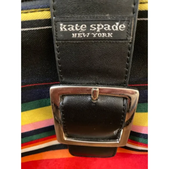 This is a pre-owned Kate Spade New York handbag featuring a multi-colored striped pattern on a black background. The bag has a black leather trim, a silver buckle closure, and a top zipper closure. The bag has two top handles and is adorned with silver studs around the edges. The interior is lined with black fabric and has a small zippered pocket. The bag measures approximately 10 inches wide, 7 inches tall, and 4 inches deep.