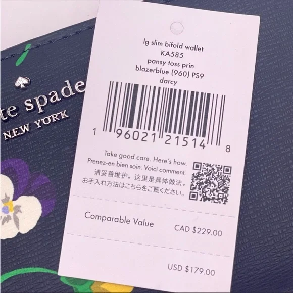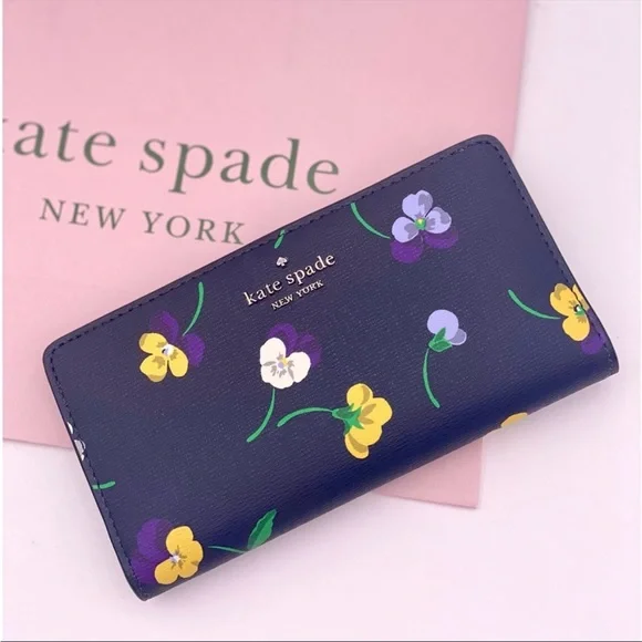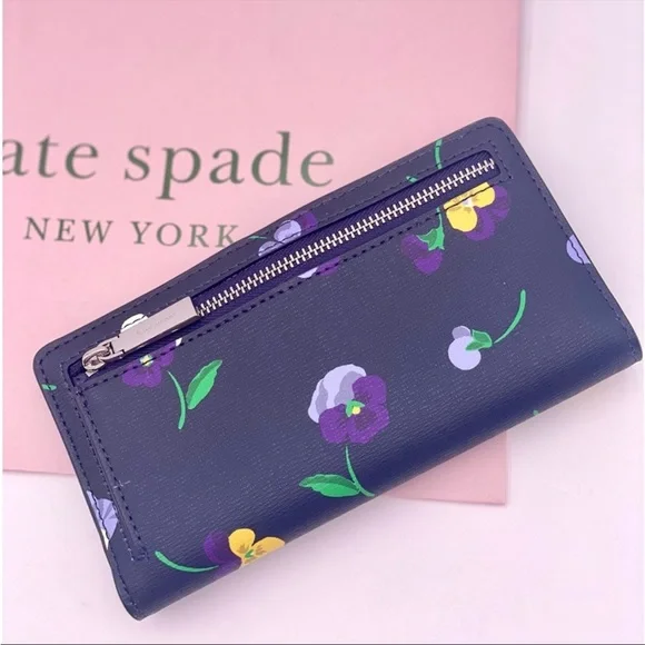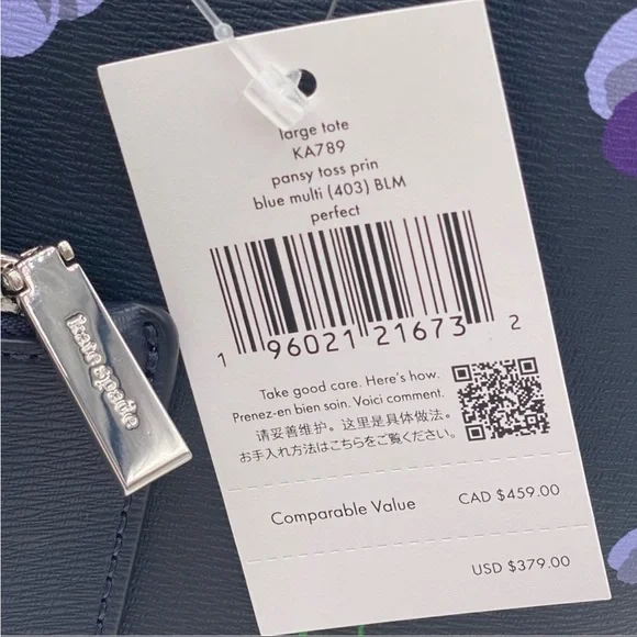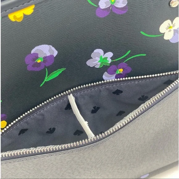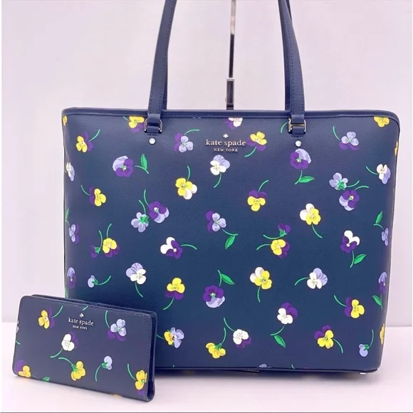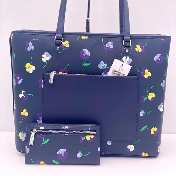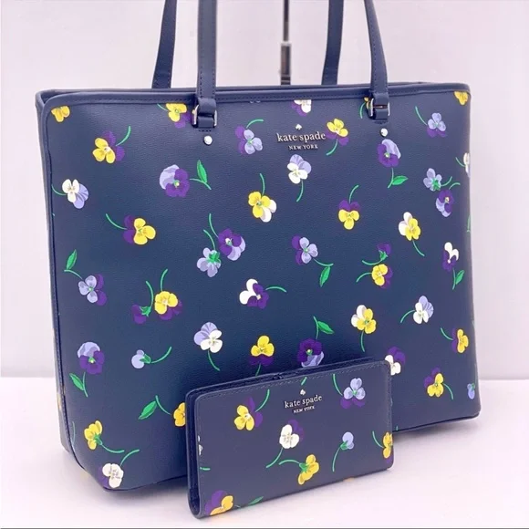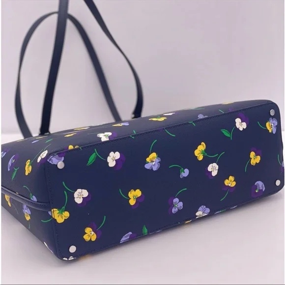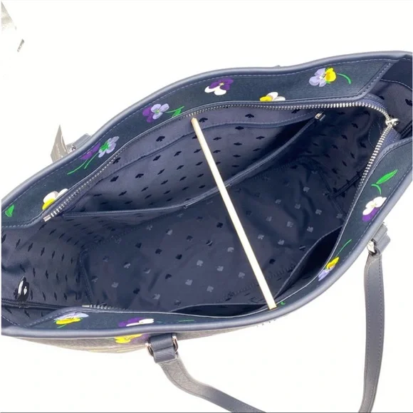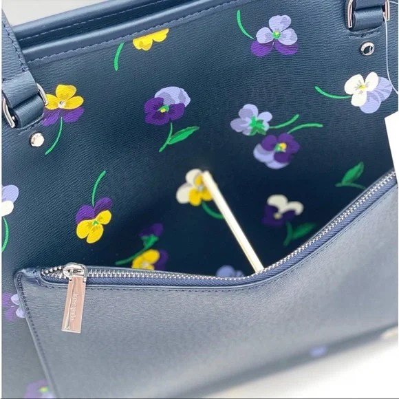 Brand New with tagColor: Blue MultiPerfect Large Tote pansy toss printMeasurements11.72" H × 5.4" D × 15.6" W (top) 13.9" W (bottom)Handle Drop: 11.0"FeaturesMetal Pinmount LogoClosure Type: drop in top zip closure interior: front & back slip pocket exterior: back slip & zip pocketMaterials textured pvcLining: Two Way Spade Jacquard LiningStyle Number KA789
