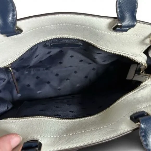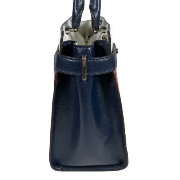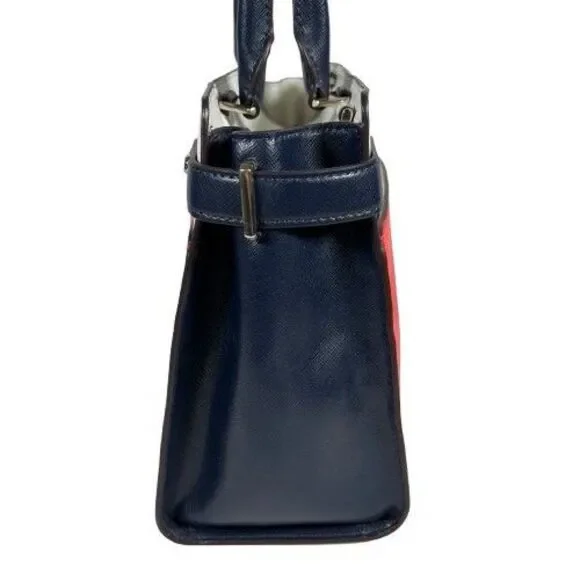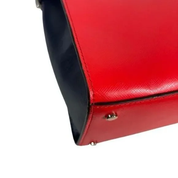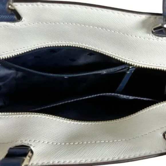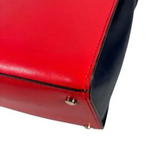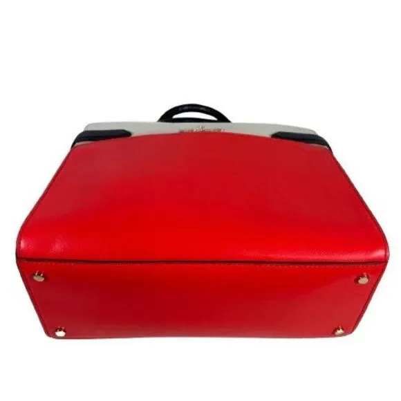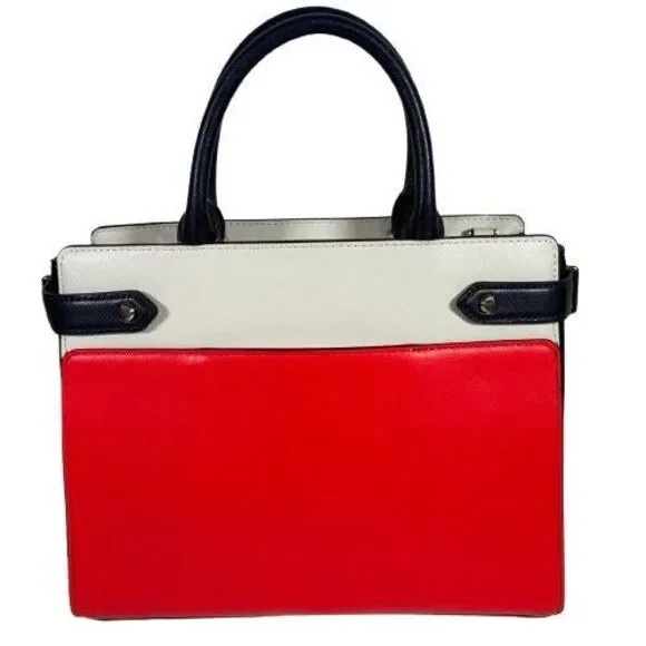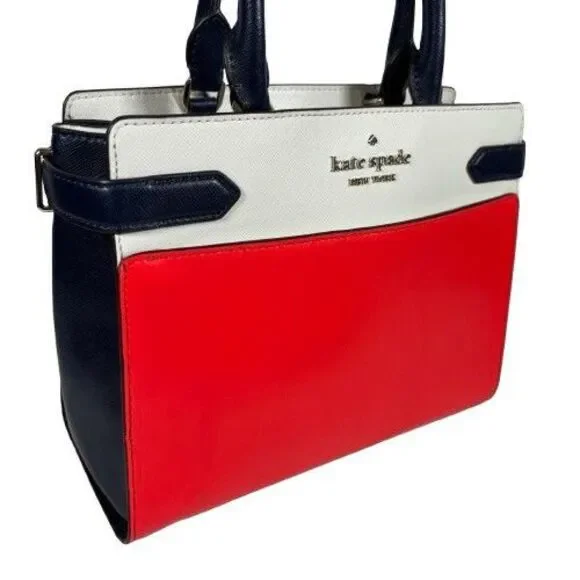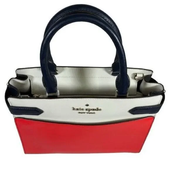 Kate Spade New York Staci Colorblock Cameron Saffiano Leather Satchel Crossbody. What a great bag with patriotic colors for summer and 4th of July! New without tags. Never used. Please see pictures.* Guaranteed authentic.* Colorblock saffiano leather.* Zip closure.* Interior: one main compartment with zip pocket and slip pocket.* Exterior: full length slip pocket on the front, smaller slip pocket on the back.* Silver tone hardware.* Adjustable/removable shoulder strap with a 25" drop for shoulder or crossbody wear.* Size: approximately 11" x 9" x 5".Check out our huge selection of thrifted treasures - bundle your purchases and save on combined shipping!We show pictures of every possible angle and include measurements in all listings. Please examine all pictures and description. If we overlooked something, or you need clarification on something, please ask questions prior to purchase.